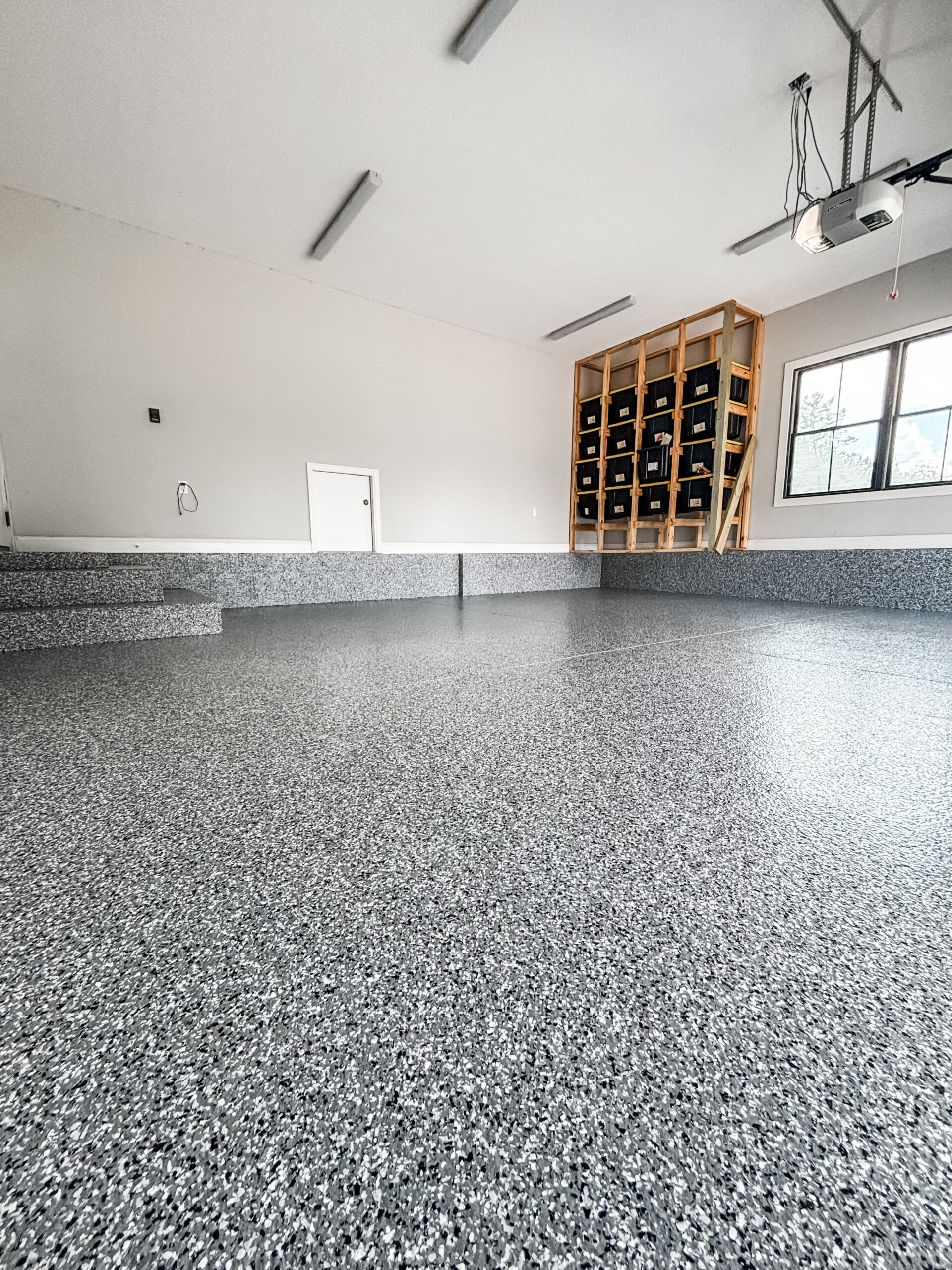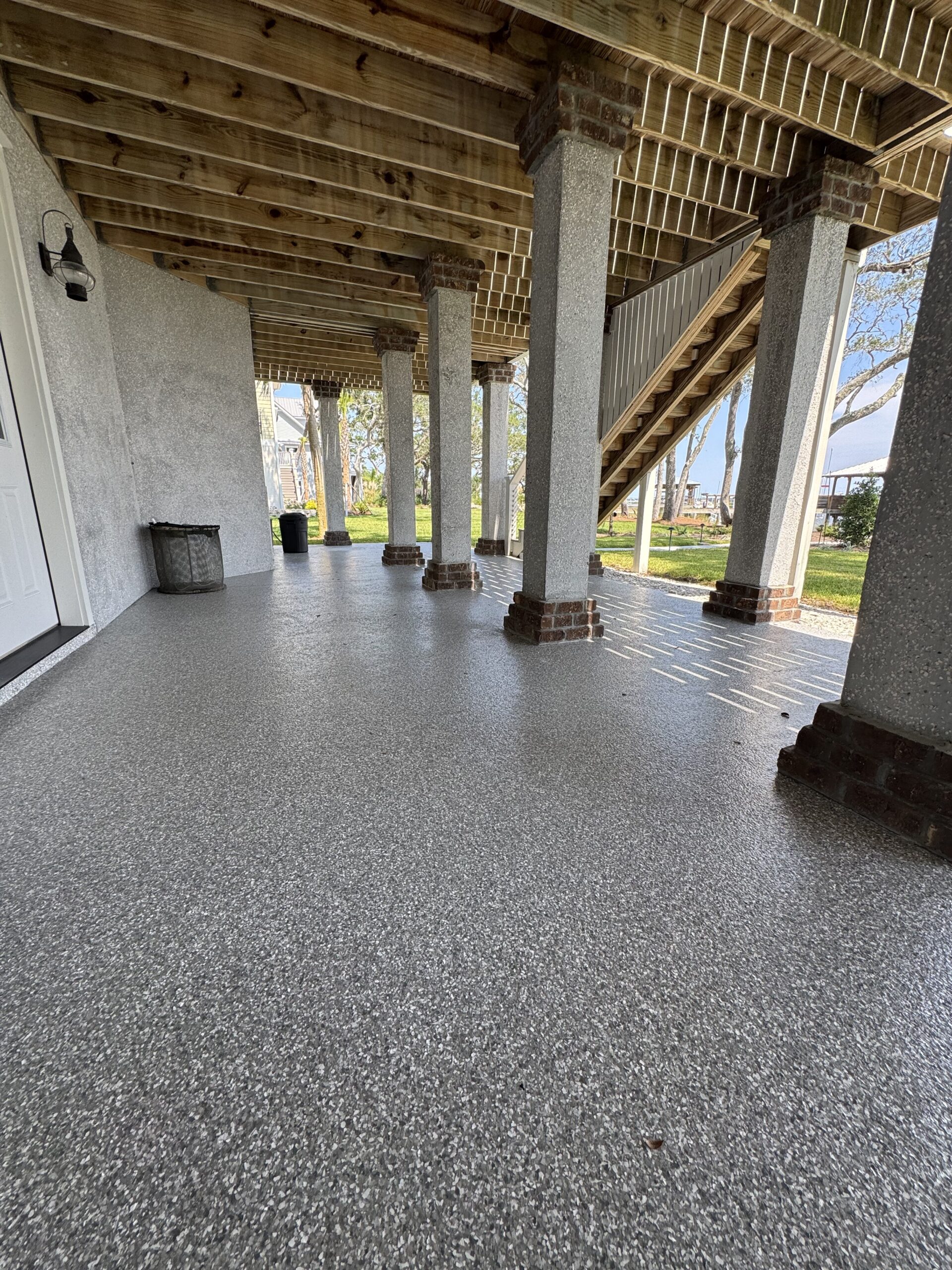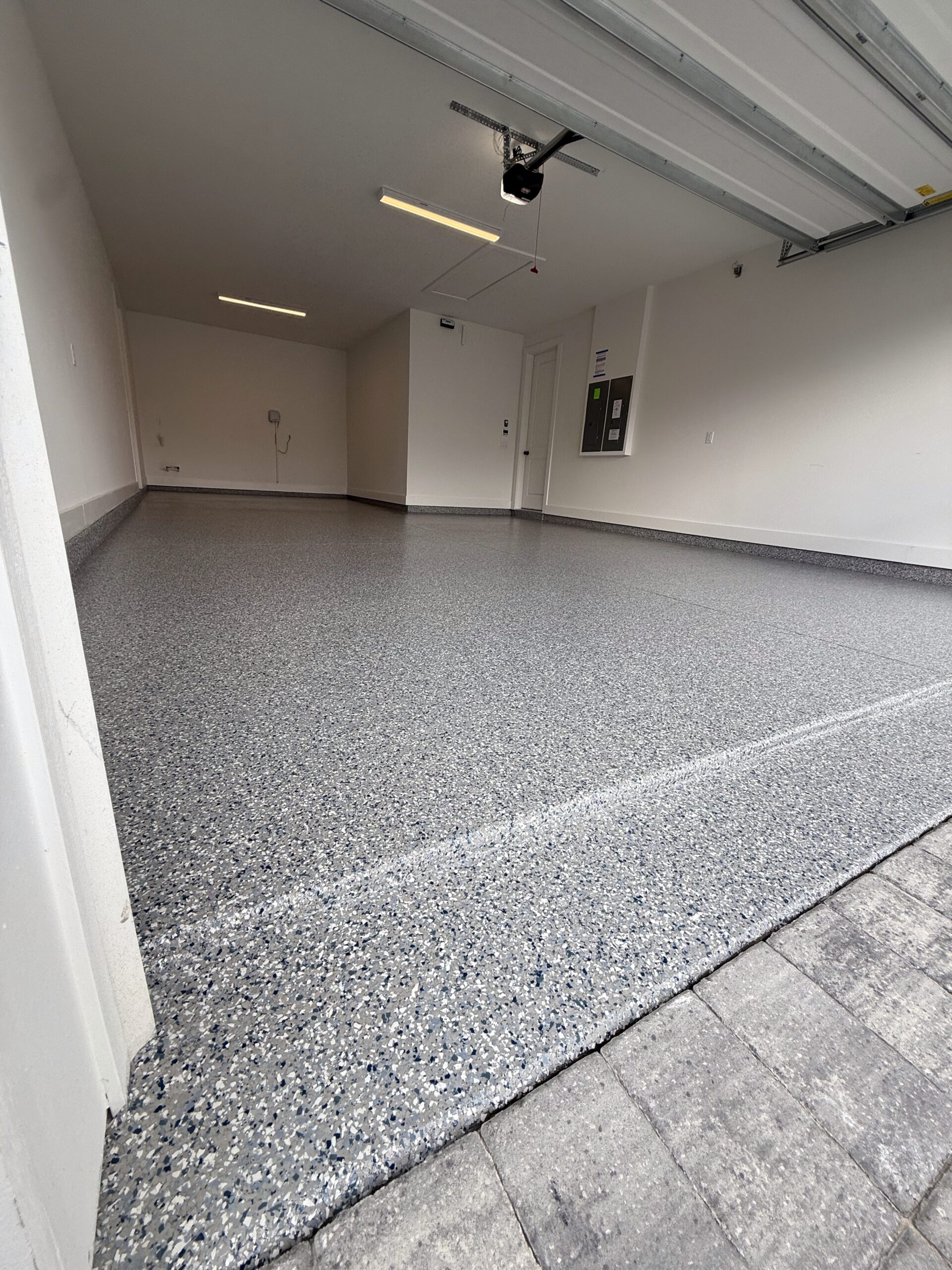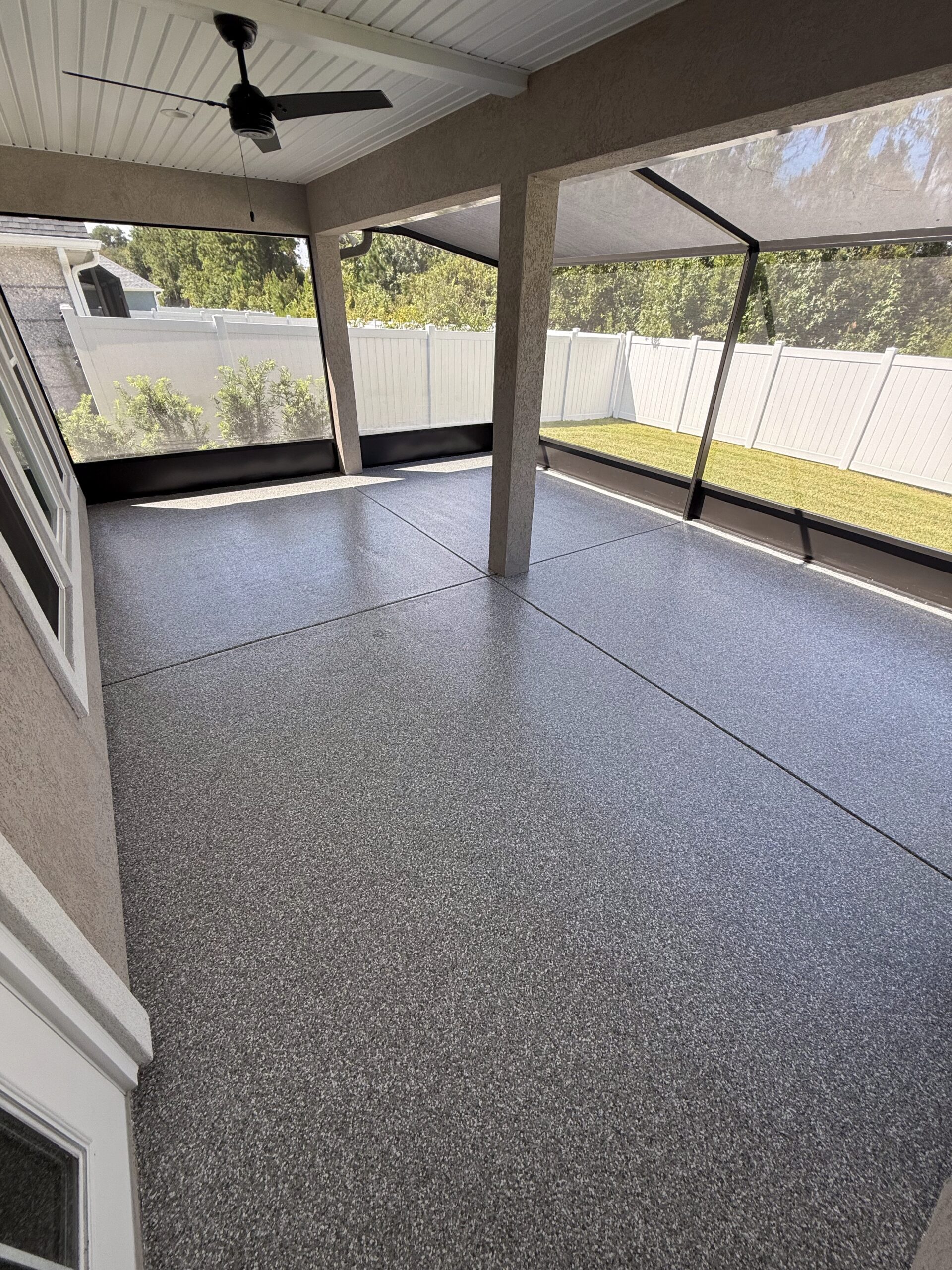 Florida & Georgia weather isn’t easy on concrete floors. That’s why we use a polyaspartic flake system, engineered to outlast epoxy and handle sun exposure, storms, spills, and foot traffic with ease.