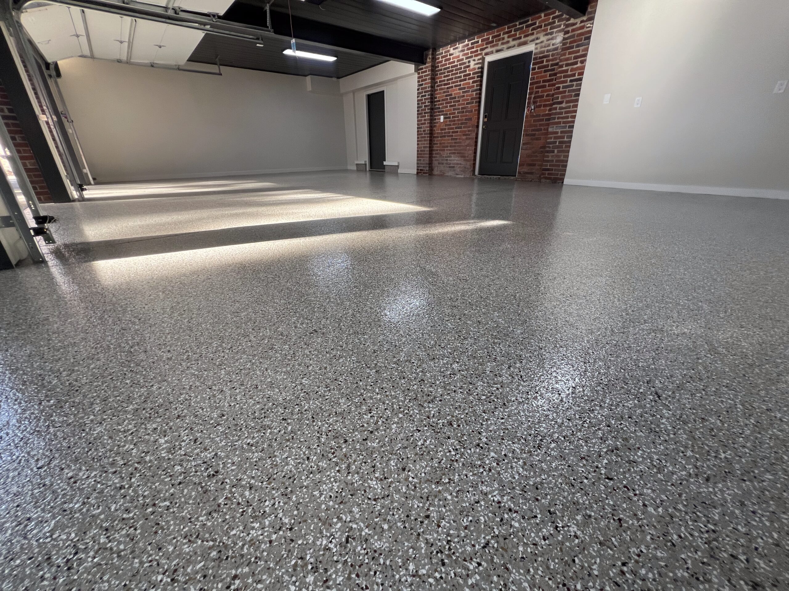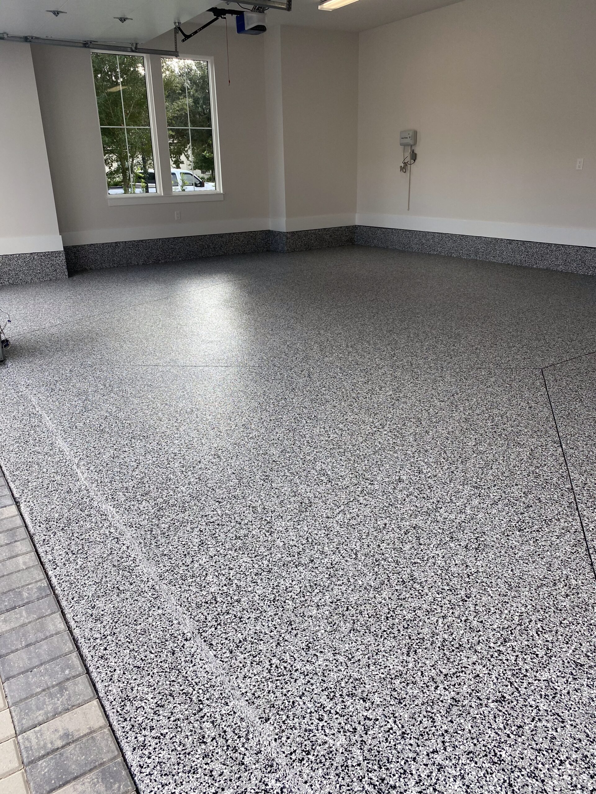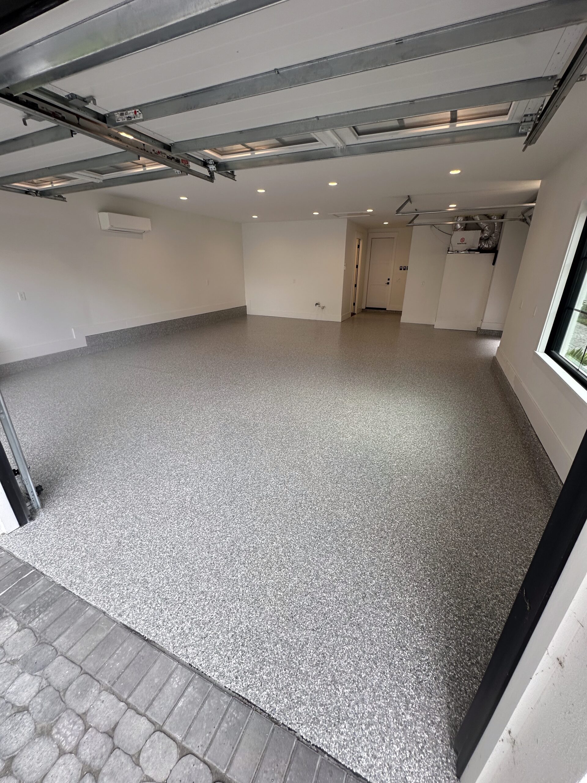 Florida & Georgia weather isn’t easy on concrete floors. That’s why we use a polyaspartic flake system, engineered to outlast epoxy and handle sun exposure, storms, spills, and foot traffic with ease.
