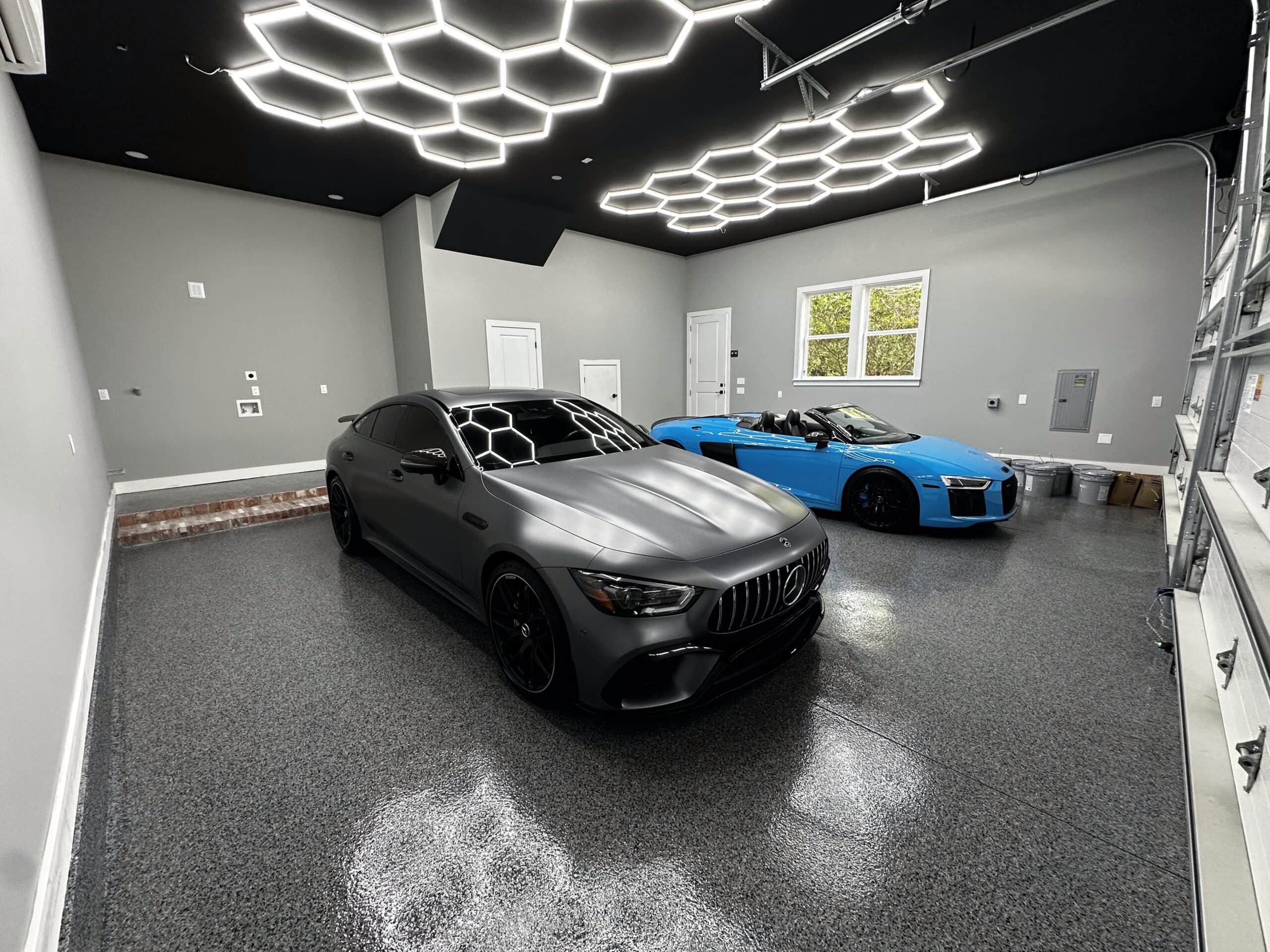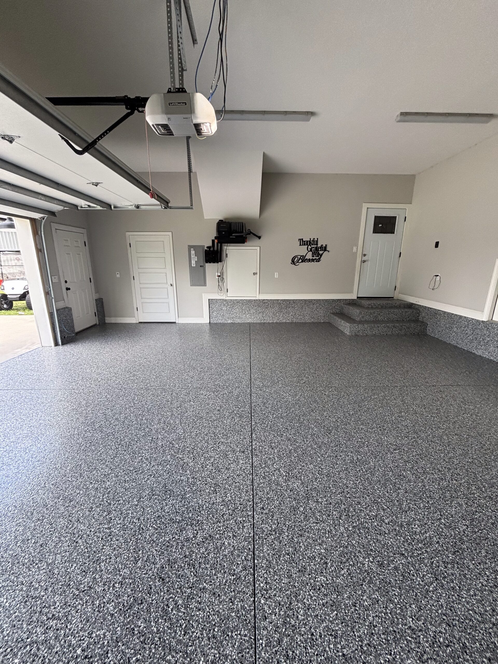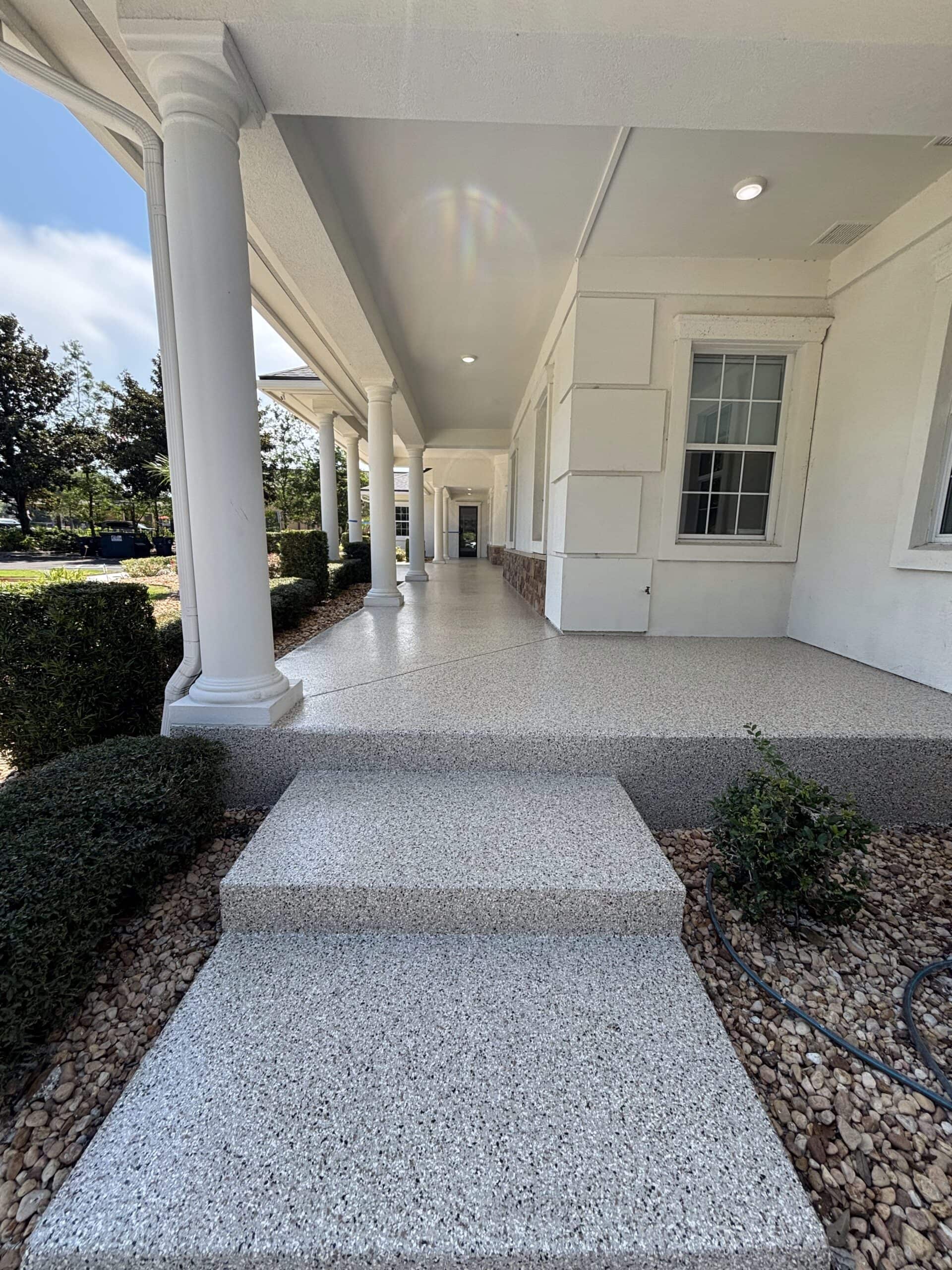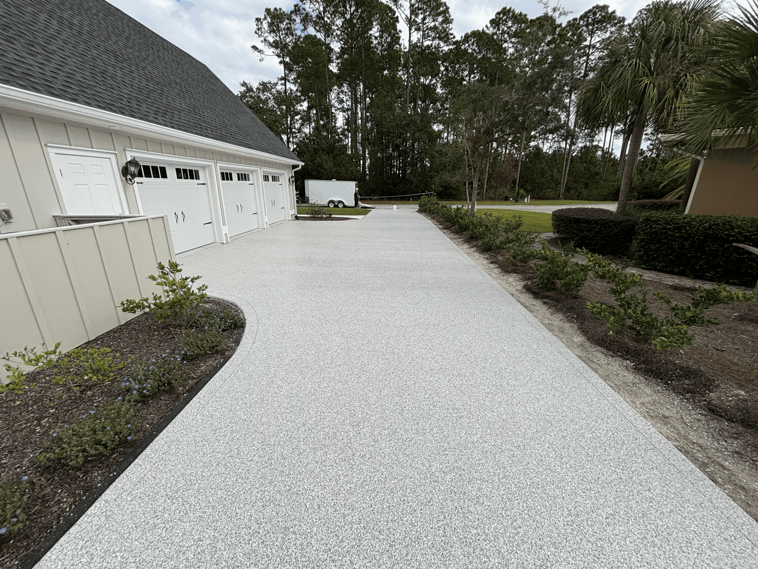 Florida & Georgia weather isn’t easy on concrete floors. That’s why we use a polyaspartic flake system, engineered to outlast epoxy and handle sun exposure, storms, spills, and foot traffic with ease.