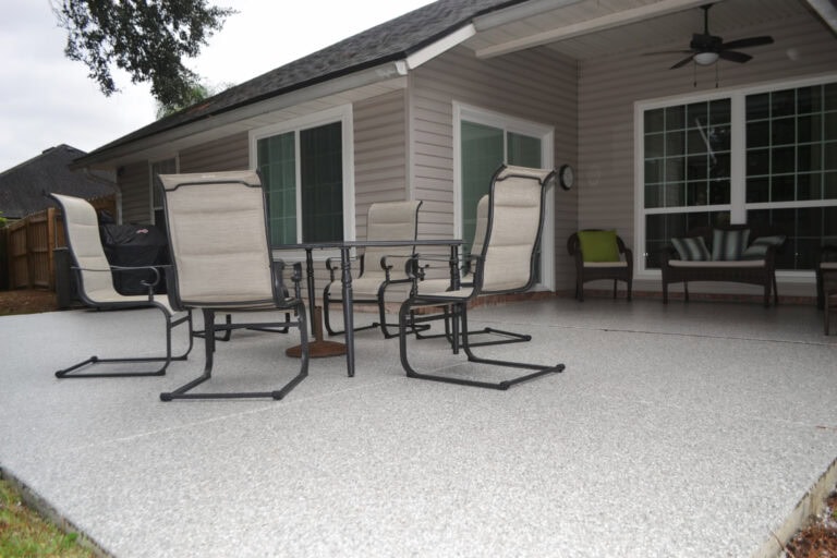 This back patio features a refreshing Tidal Wave flake finish, delivering a bright, coastal-inspired aesthetic that instantly enhances the outdoor living space. The blend’s cool tones and