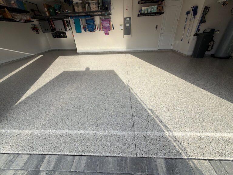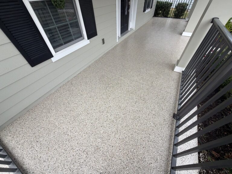 This back patio features a refreshing Tidal Wave flake finish, delivering a bright, coastal-inspired aesthetic that instantly enhances the outdoor living space. The blend’s cool tones and