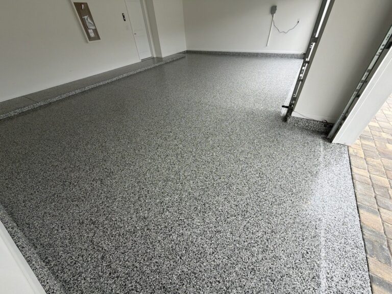 This garage features a timeless Gravel flake finish, offering a clean, modern aesthetic that blends versatility with sophistication. The balanced mix of soft greys accented with subtle