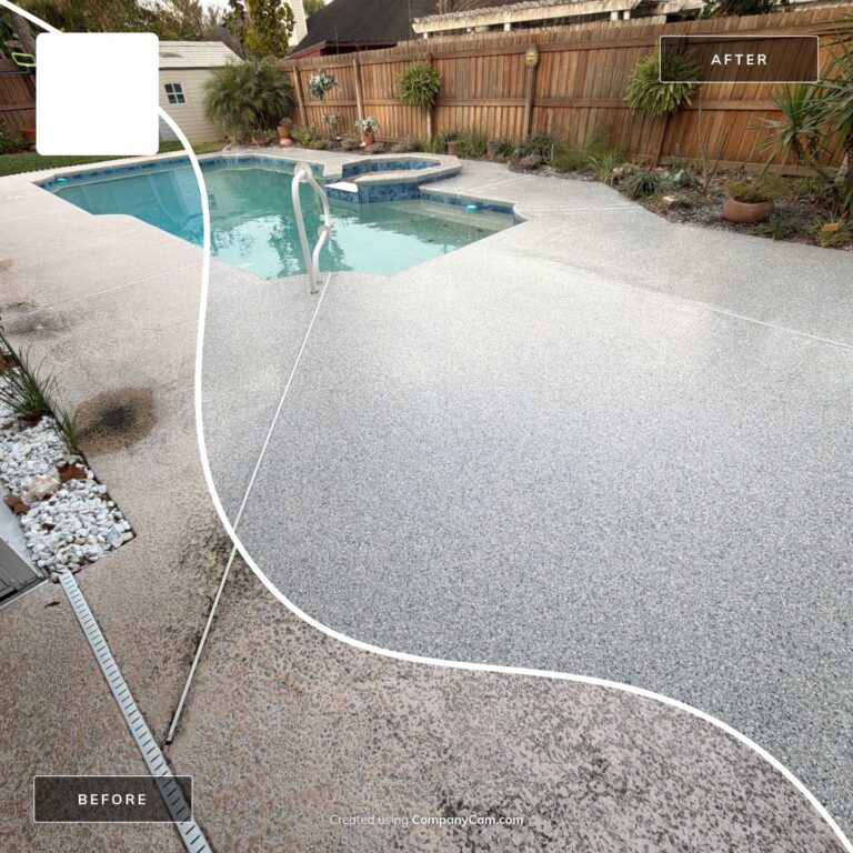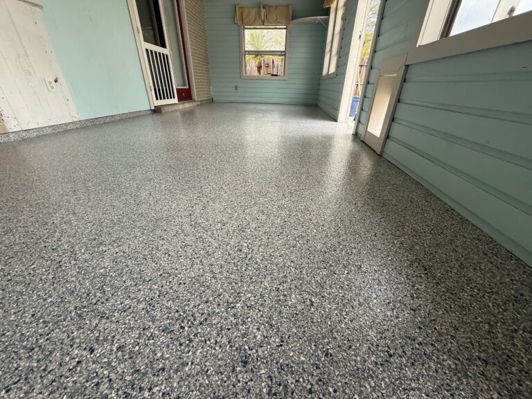 This back patio features a refreshing Tidal Wave flake finish, delivering a bright, coastal-inspired aesthetic that instantly enhances the outdoor living space. The blend’s cool tones and