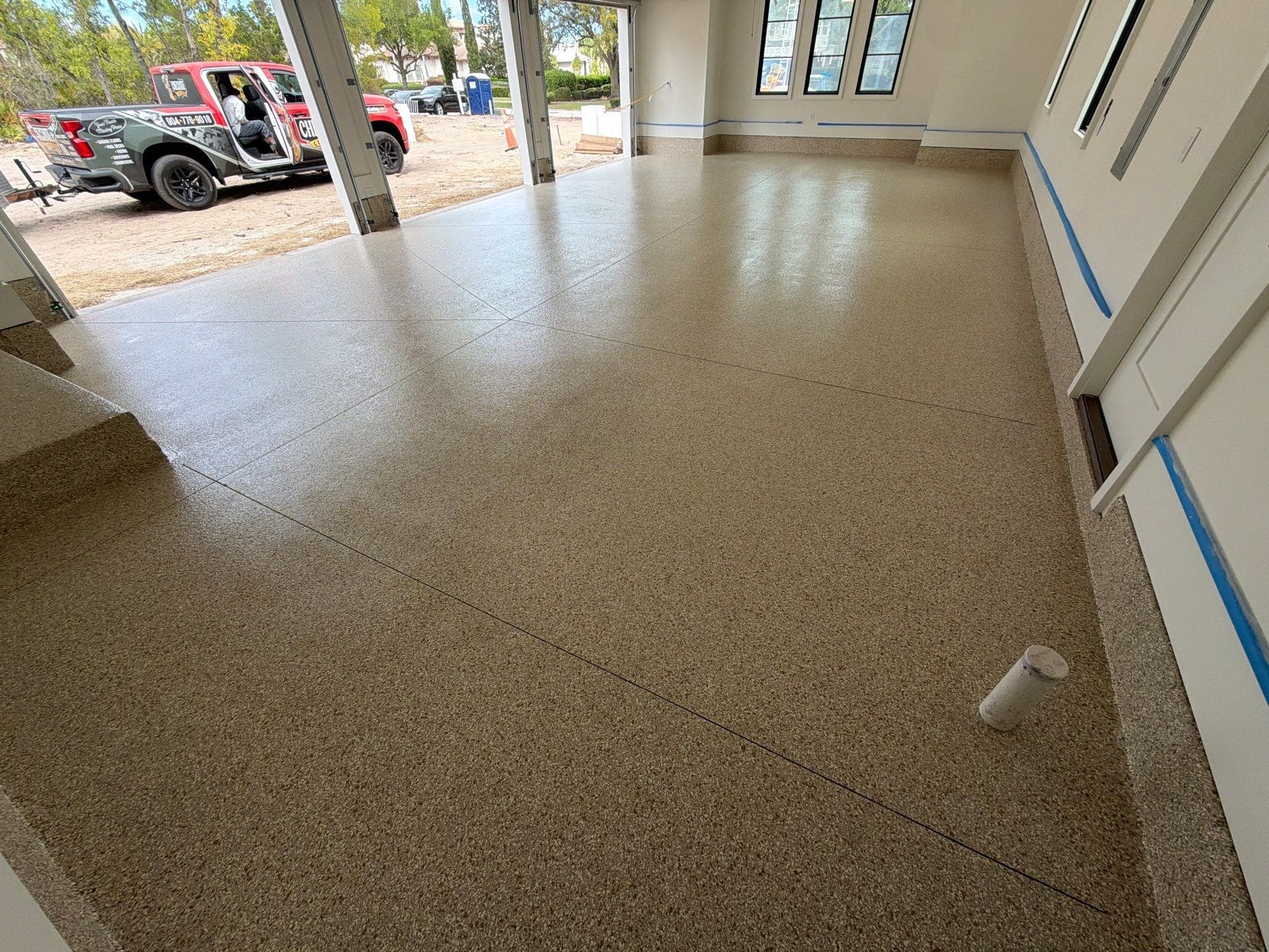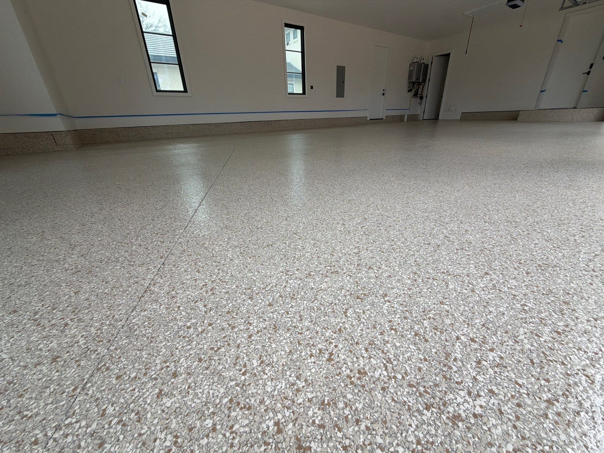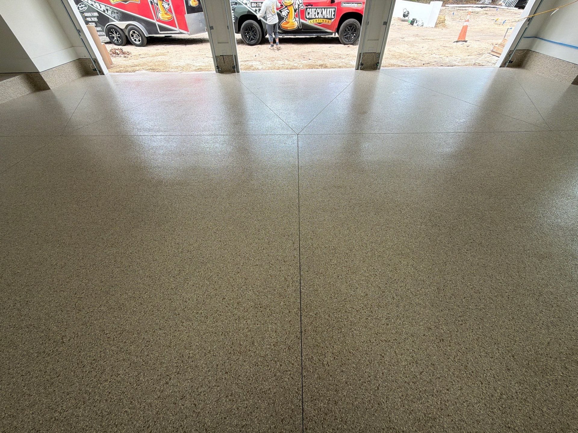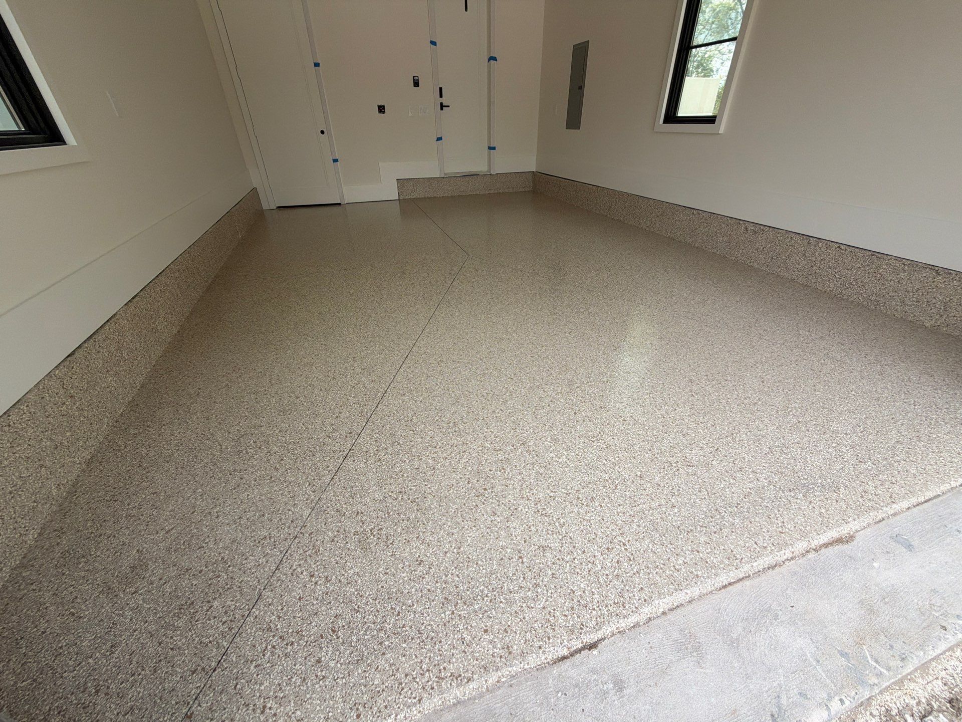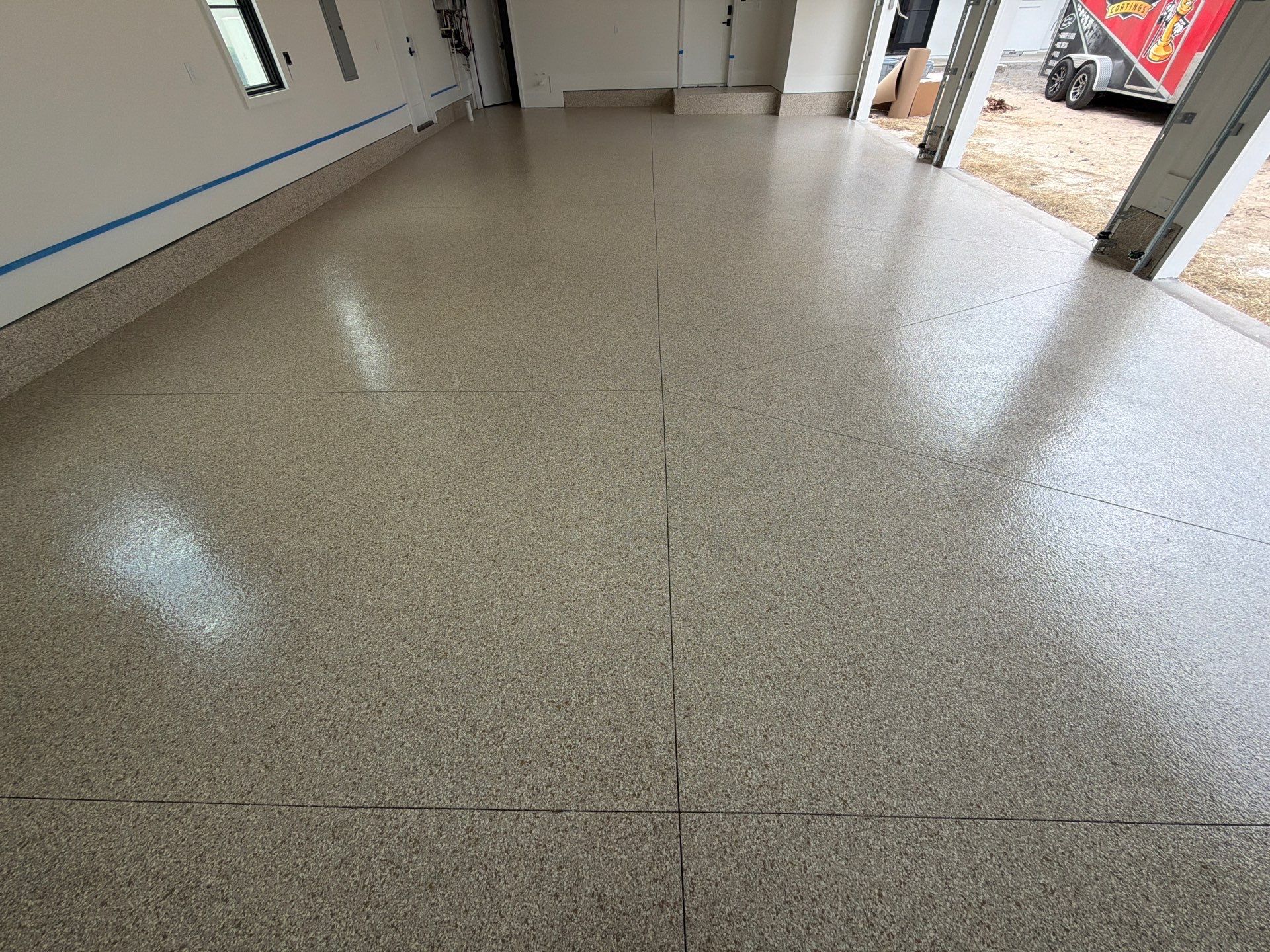 The installation began with meticulous surface preparation to ensure a solid foundation, followed by a high-performance polyurea base coat. A full flake broadcast provides complete coverage across both areas, and the system is finished with a durable polyaspartic topcoat for long-lasting protection.