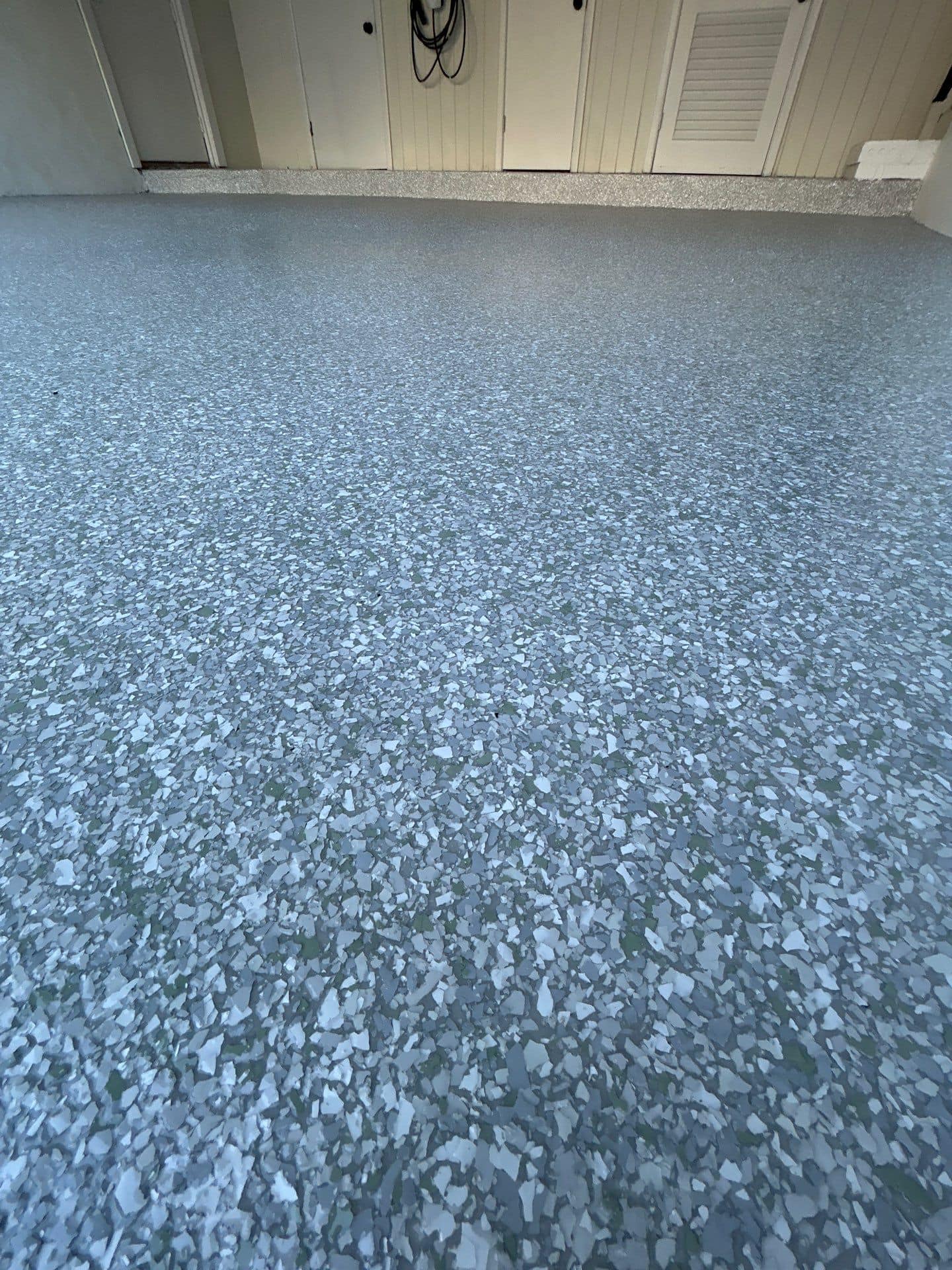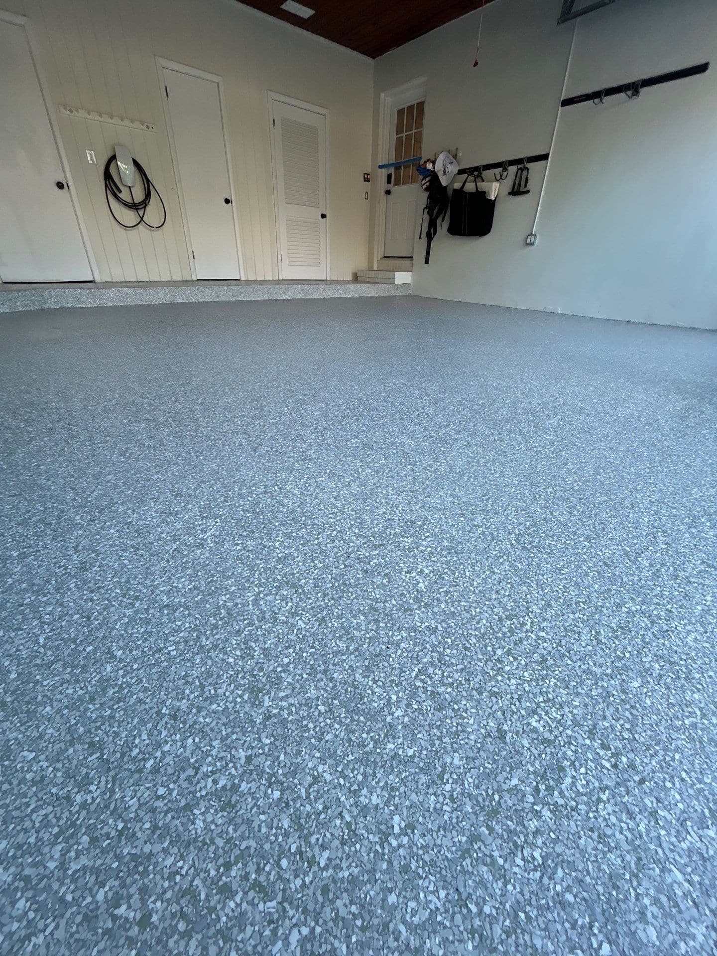 Built with meticulous surface preparation, a high-performance polyurea base coat, full flake broadcast, and a durable polyaspartic topcoat, this floor is designed for long-term performance. The result is a slip-resistant, easy-to-maintain surface that stands up to daily wear while delivering a fresh, polished finish.