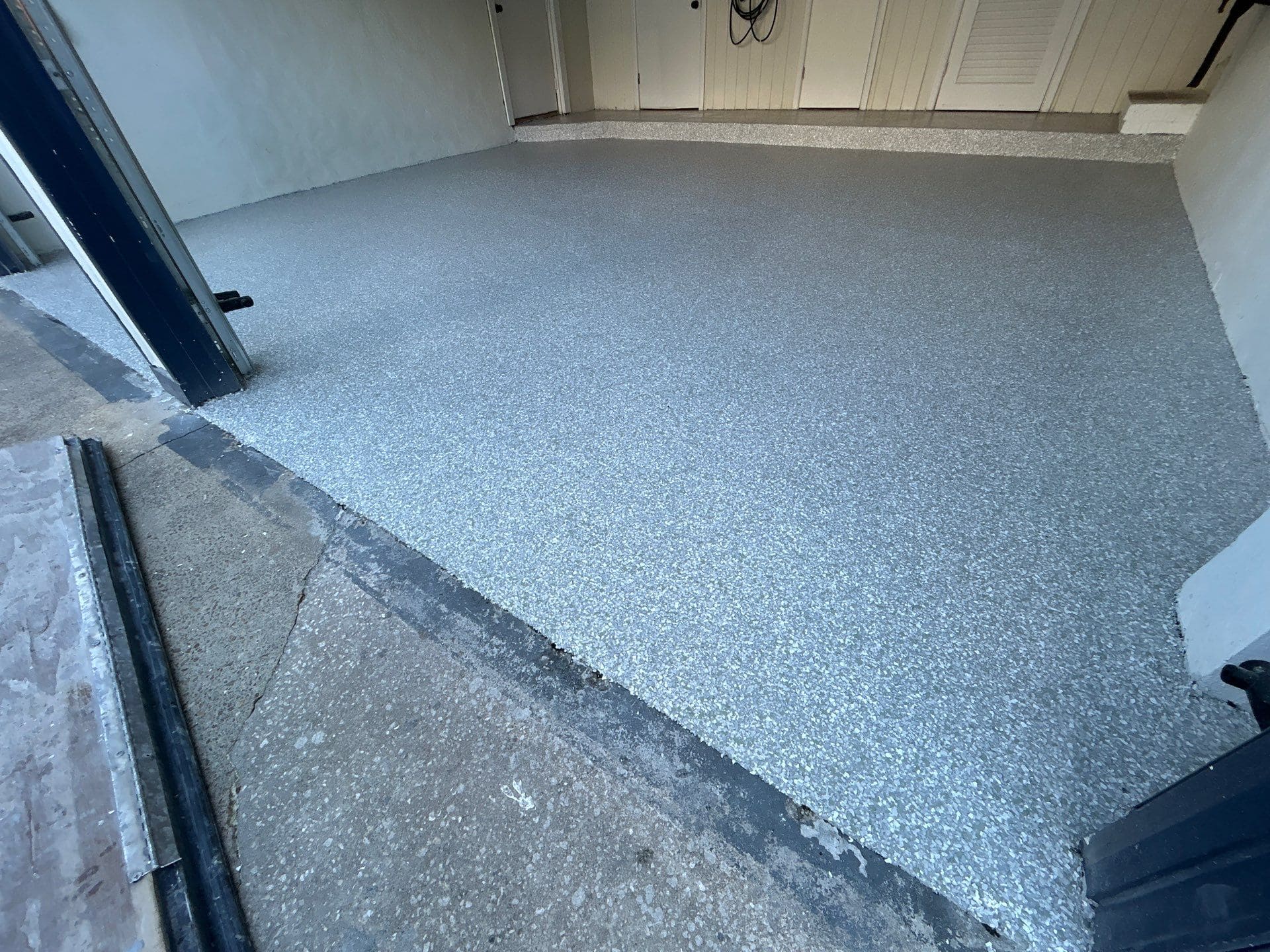 This garage features a clean, coastal-inspired finish using the Seacrest flake blend from Torginol. Soft, natural tones come together to create a bright, modern look that feels both relaxed and refined—perfect for elevating the space while keeping it versatile.