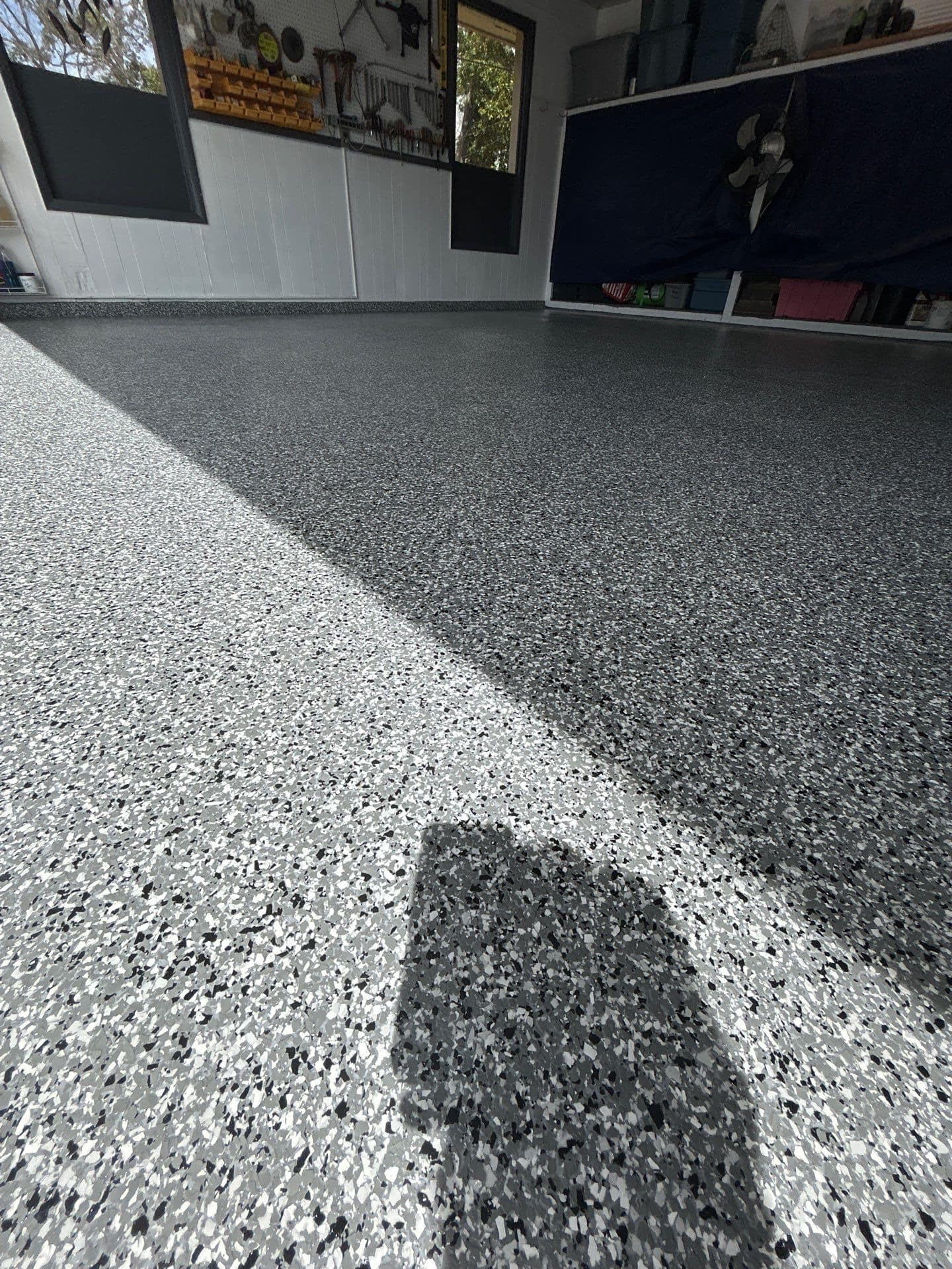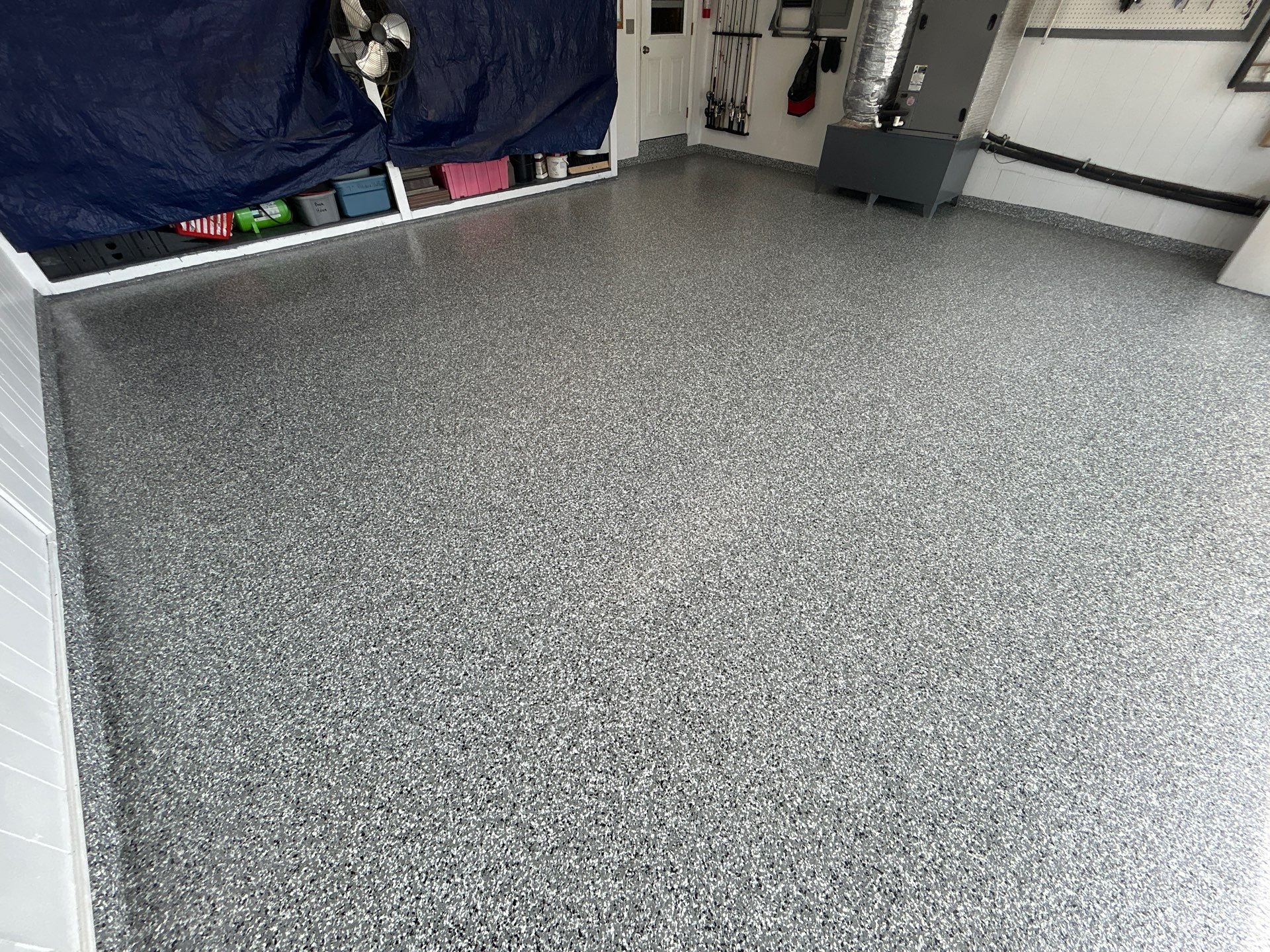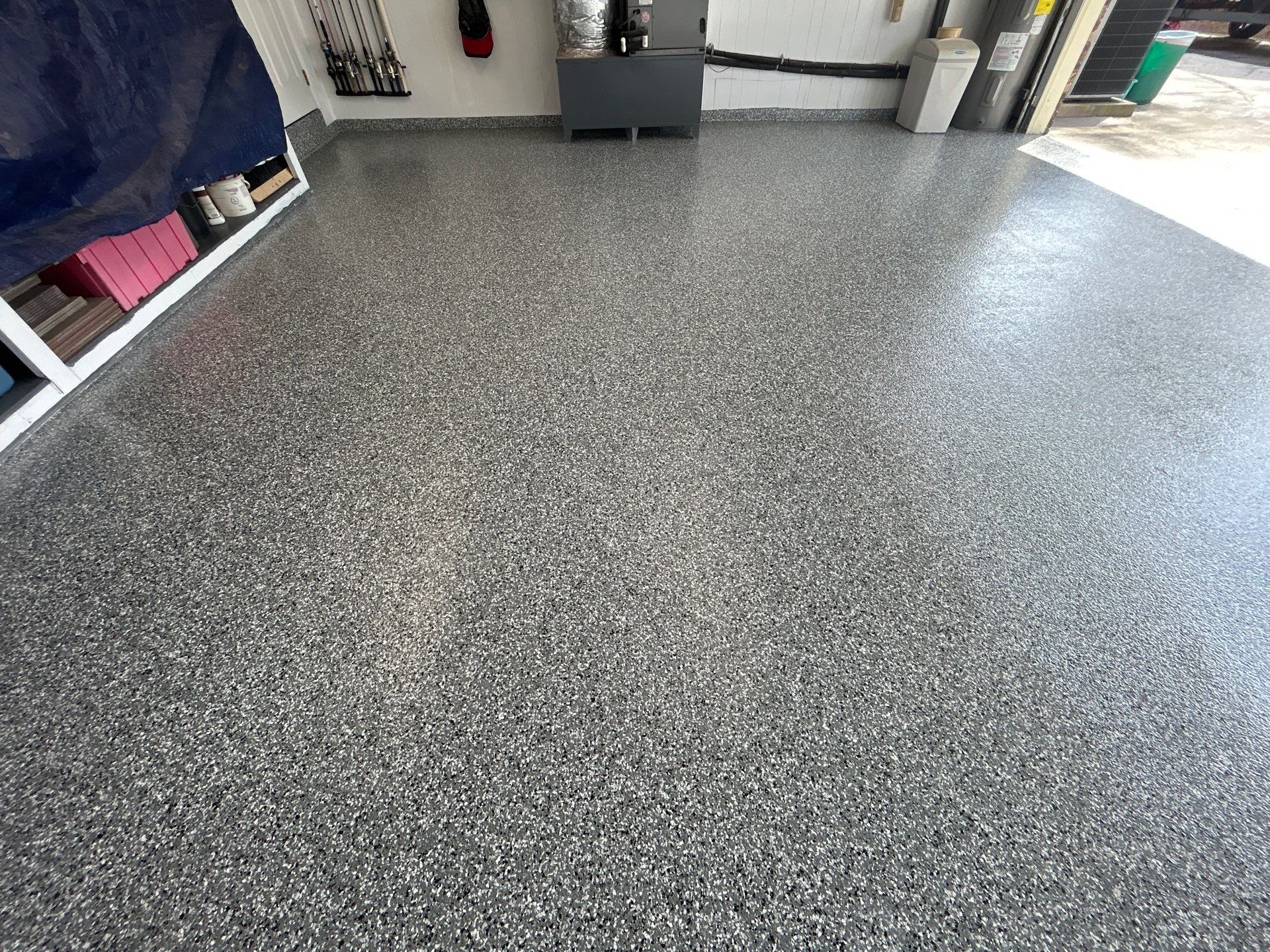 To ensure a flawless result, we began by grinding away the existing coating, creating a clean, properly prepared surface for optimal adhesion. The system was then built with a high-performance polyurea base coat, followed by a full flake broadcast for complete coverage, and finished with a durable polyaspartic topcoat for long-lasting protection.
