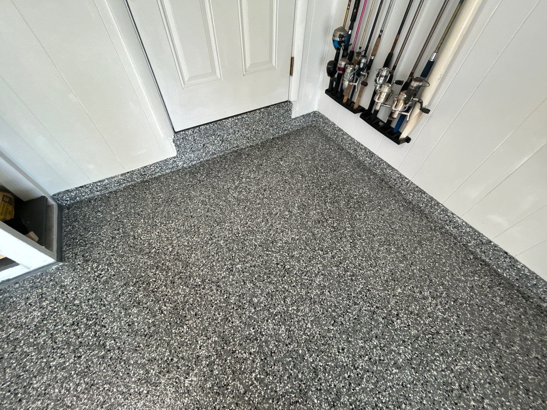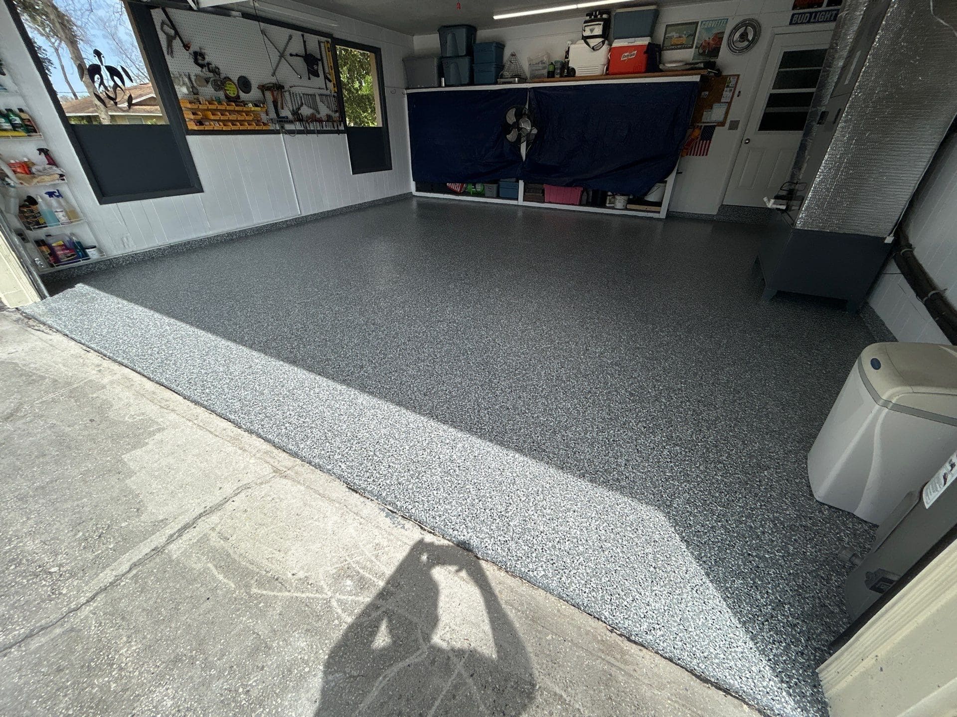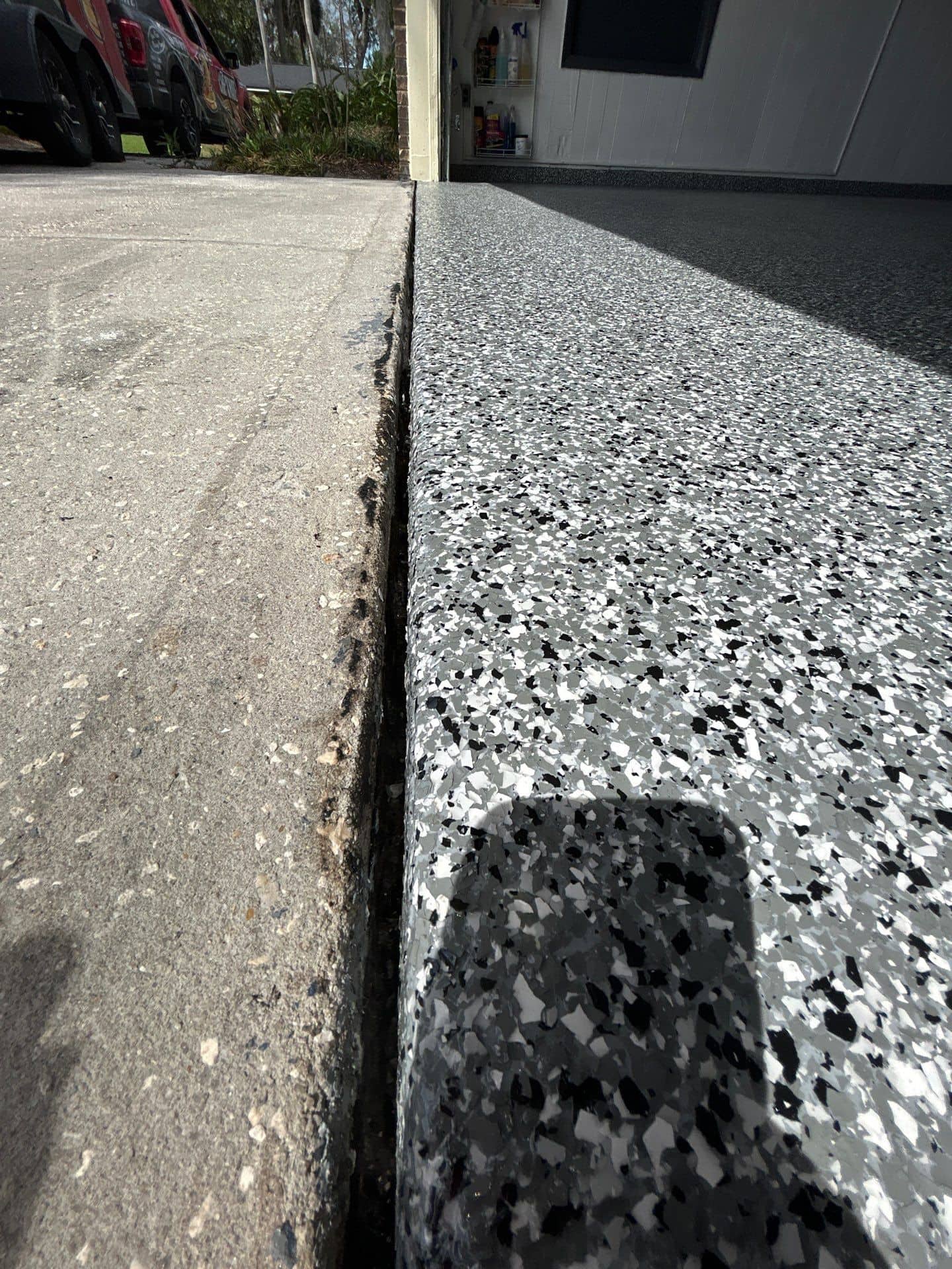 To ensure a flawless result, we began by grinding away the existing coating, creating a clean, properly prepared surface for optimal adhesion. The system was then built with a high-performance polyurea base coat, followed by a full flake broadcast for complete coverage, and finished with a durable polyaspartic topcoat for long-lasting protection.