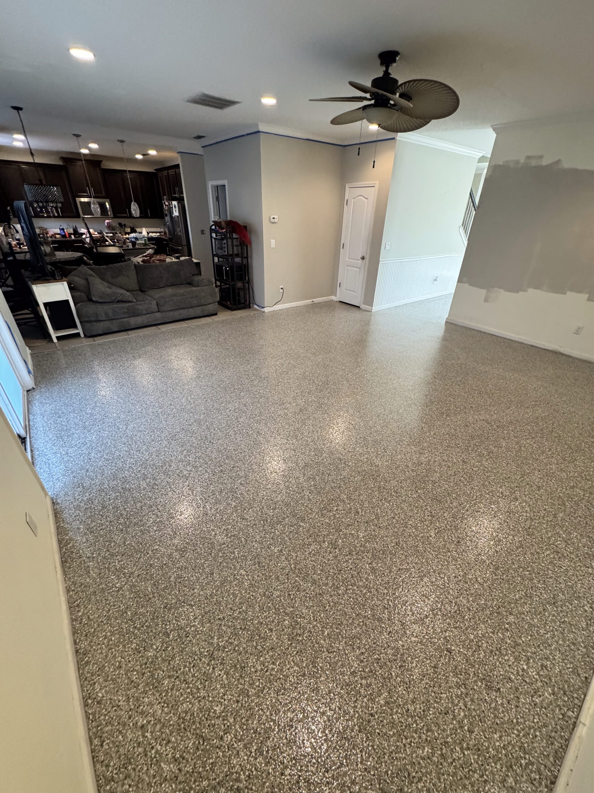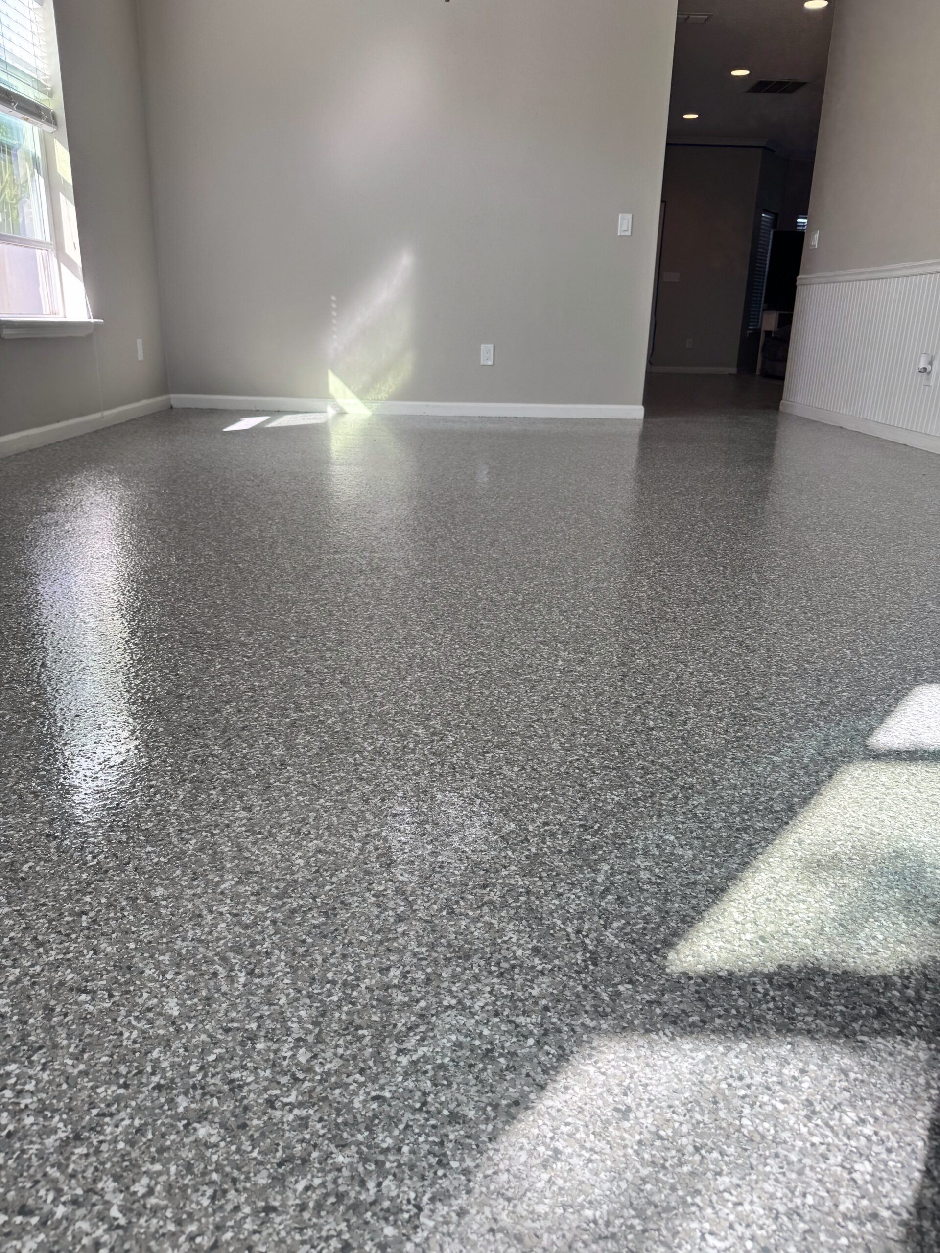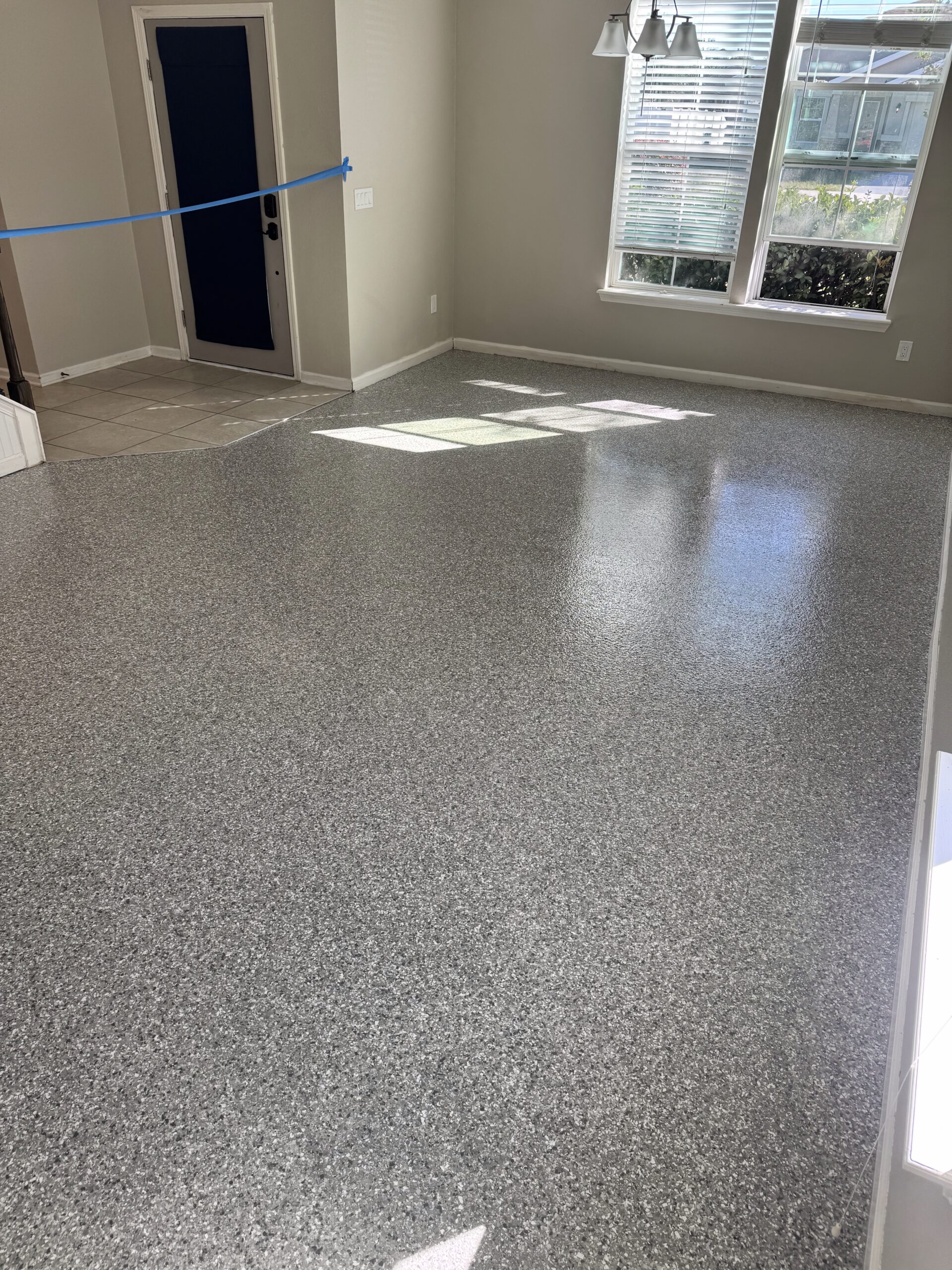 A seamless interior upgrade designed for everyday living. This home’s front room, walkway, living room, and office were all finished in the Stony Creek flake blend, creating a clean, cohesive look throughout the space. With detailed surface preparation, a polyurea base coat, full flake broadcast, and a protective polyaspartic topcoat, the result is a durable, slip-resistant, and easy-to-maintain floor that elevates both comfort and style inside the home.