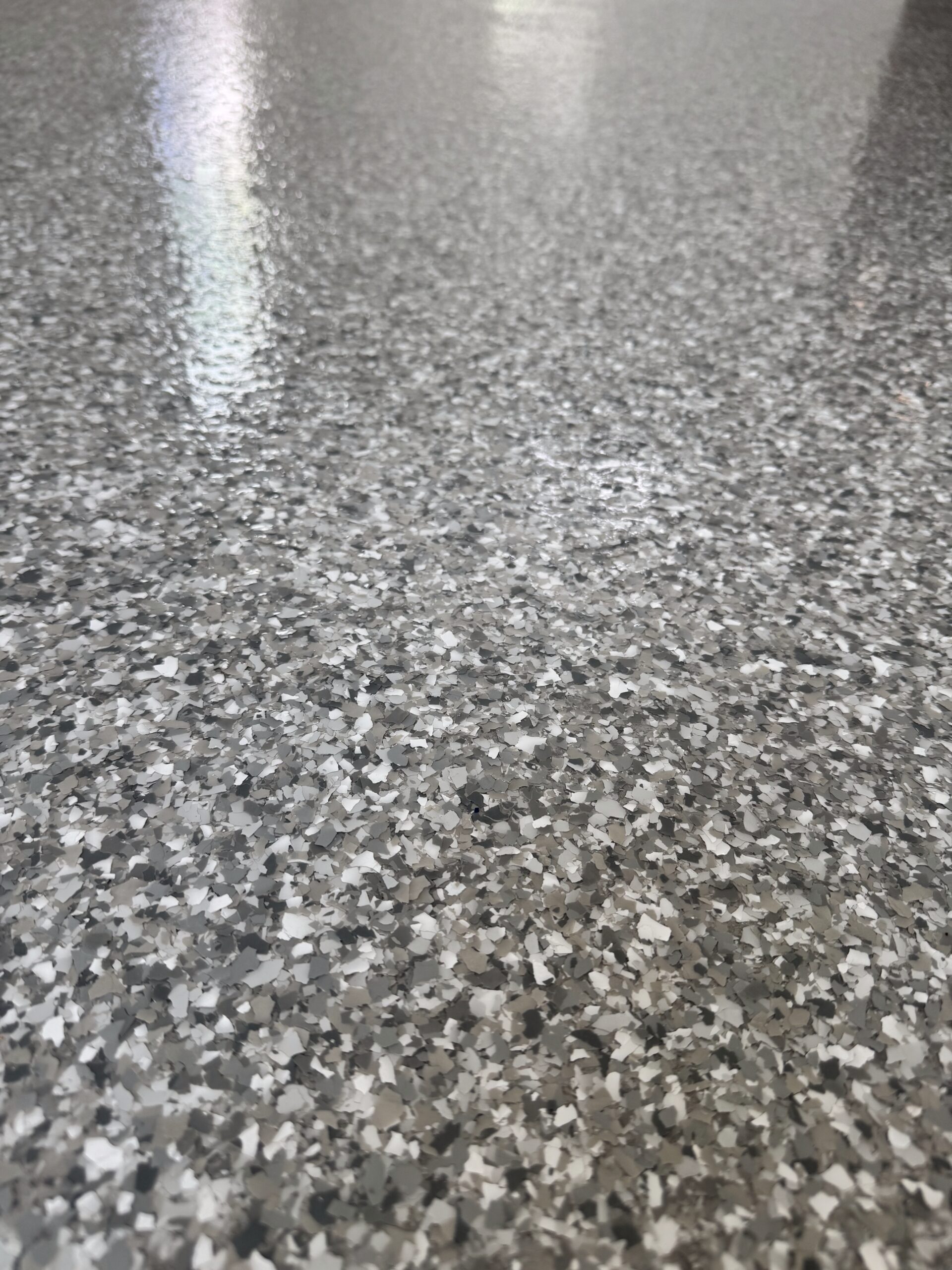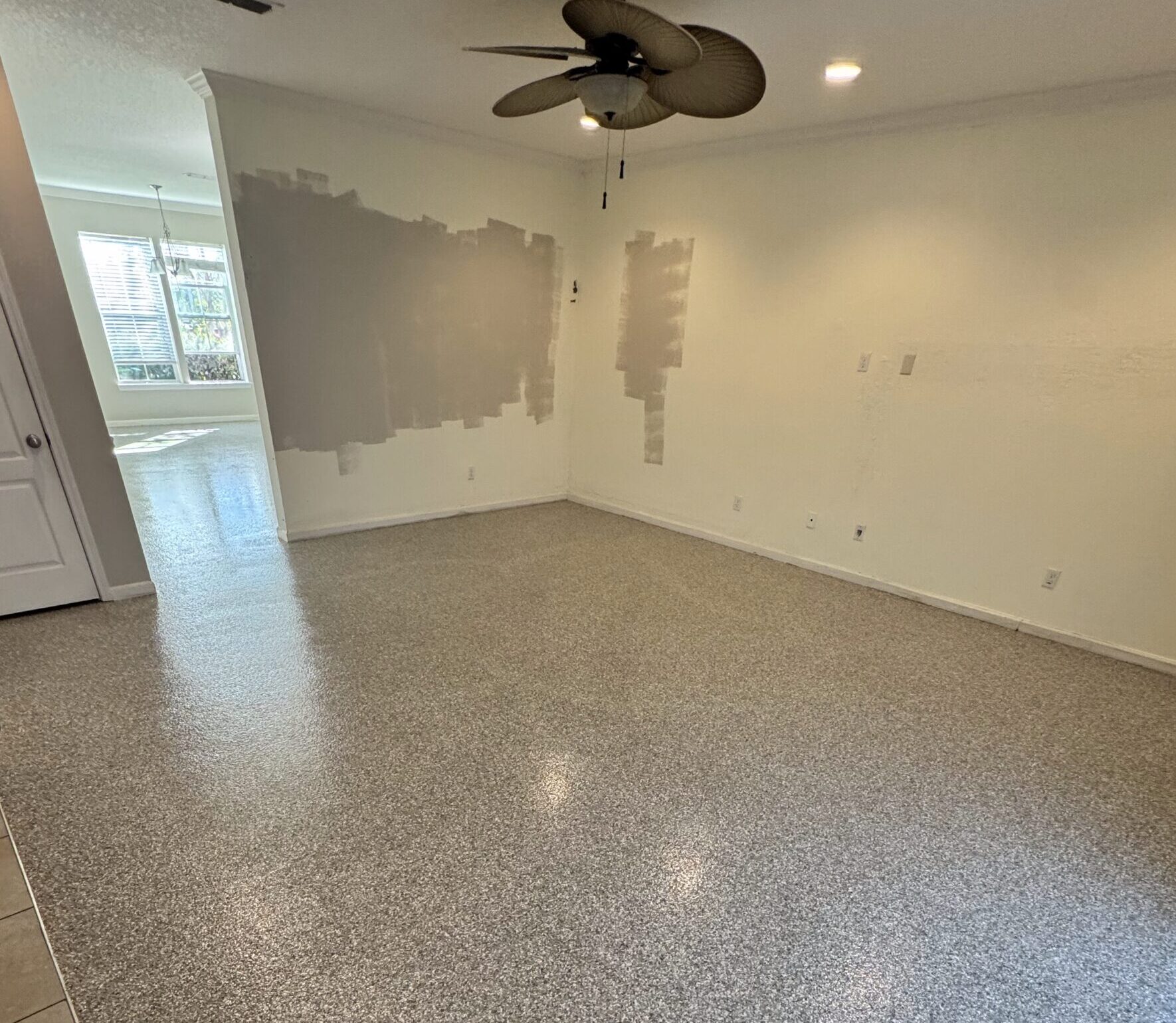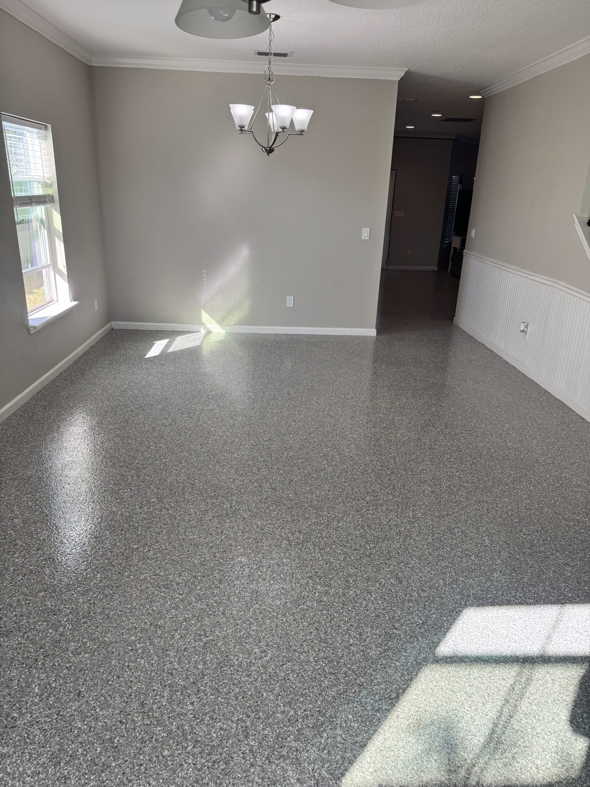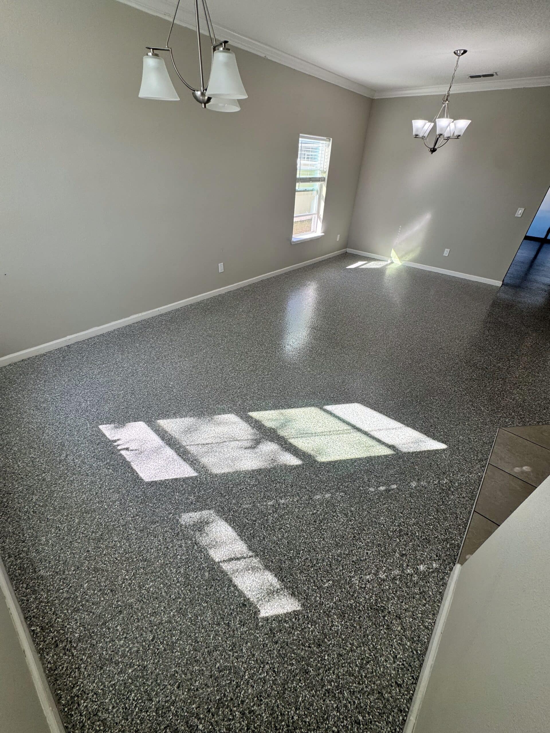 A seamless interior upgrade designed for everyday living. This home’s front room, walkway, living room, and office were all finished in the Stony Creek flake blend, creating a clean, cohesive look throughout the space. With detailed surface preparation, a polyurea base coat, full flake broadcast, and a protective polyaspartic topcoat, the result is a durable, slip-resistant, and easy-to-maintain floor that elevates both comfort and style inside the home.