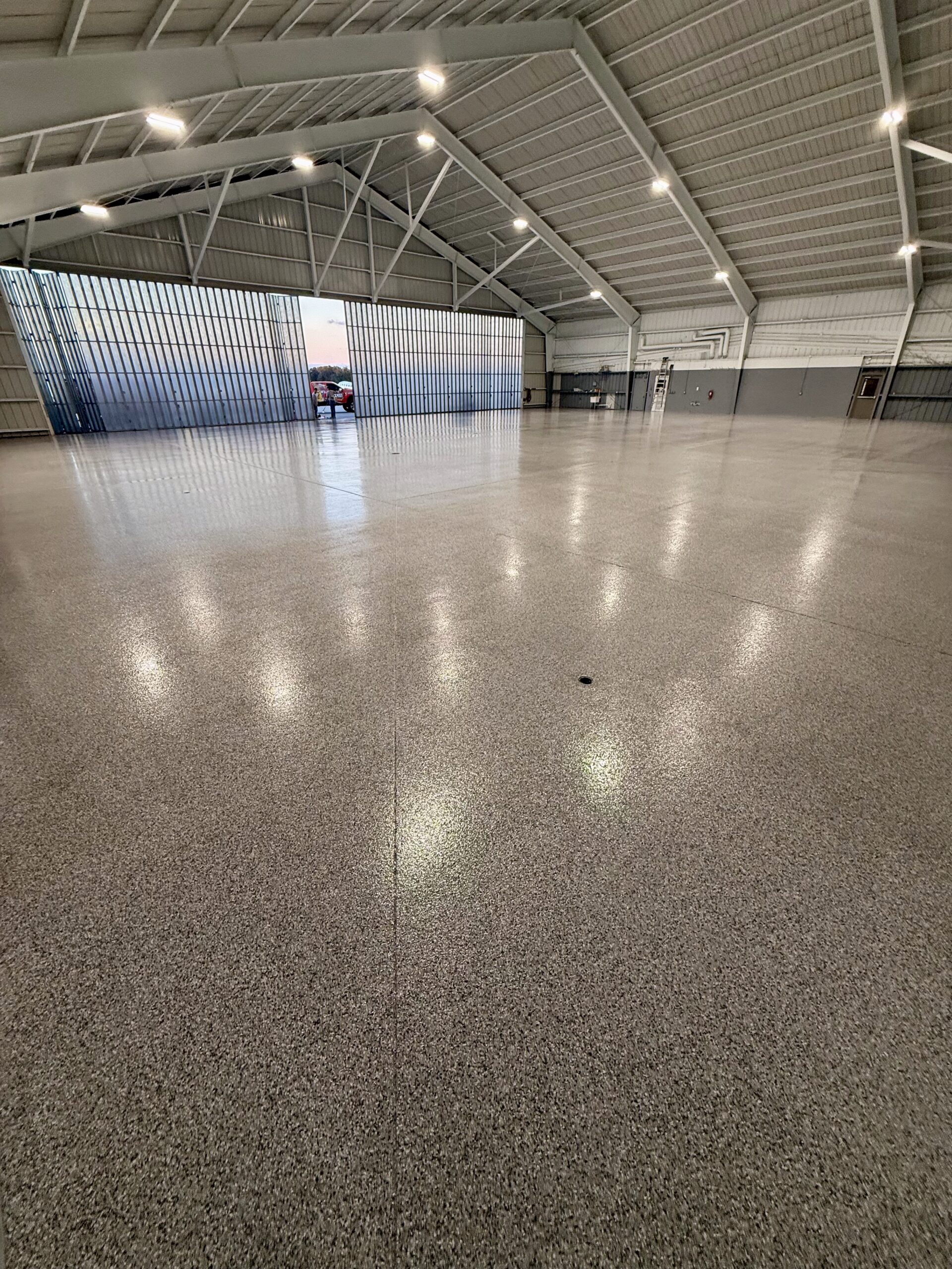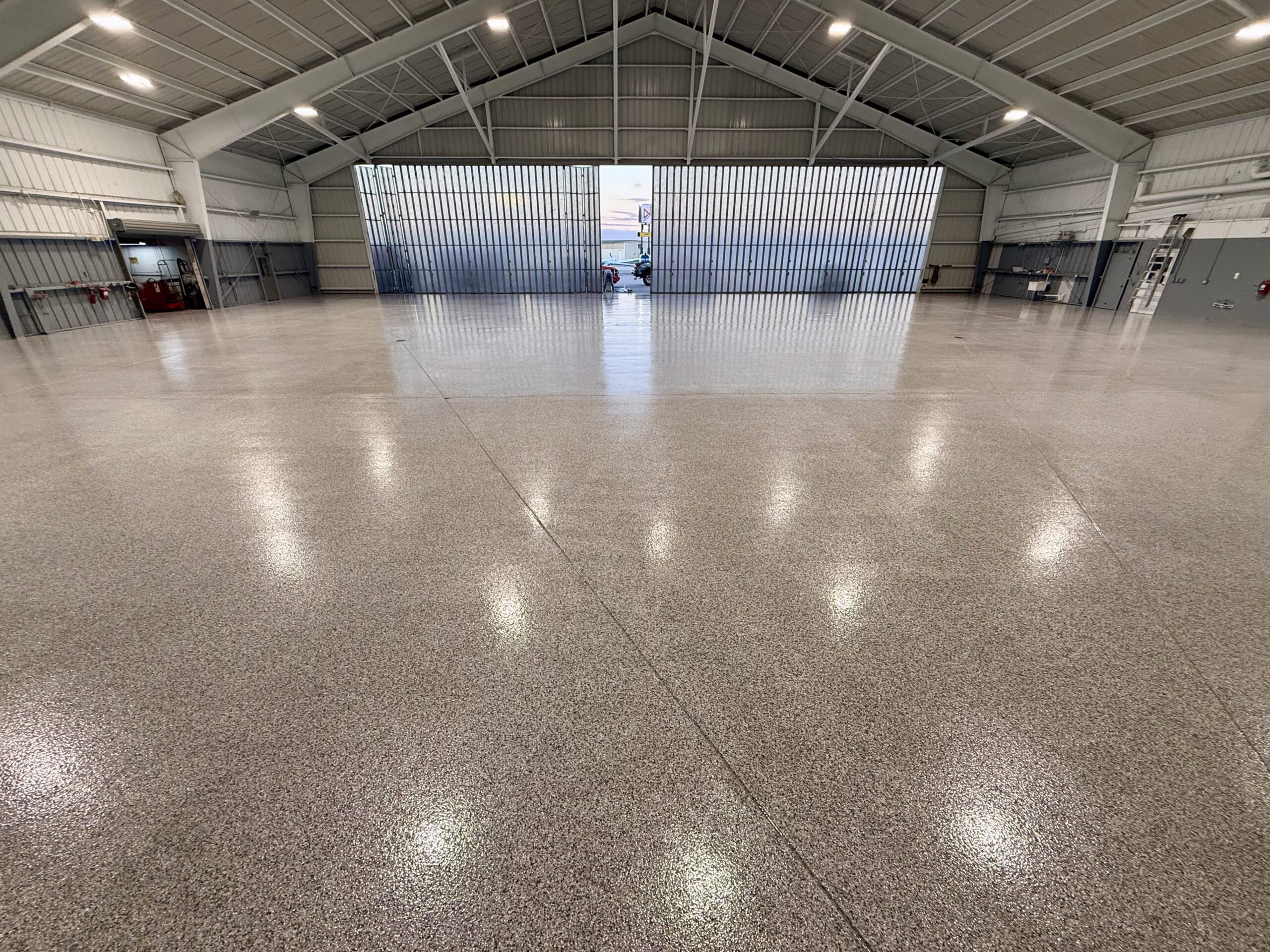 A full flooring transformation at Jacksonville Executive at Craig Airport, finished in the Gravel flake blend for a clean, professional look. The process included detailed surface preparation, a polyurea base coat, full flake broadcast, and a protective polyaspartic topcoat—creating a durable, slip-resistant, and easy-to-maintain surface built for a high-traffic aviation environment. Be sure to check out the before-and-after photos to see the dramatic upgrade.