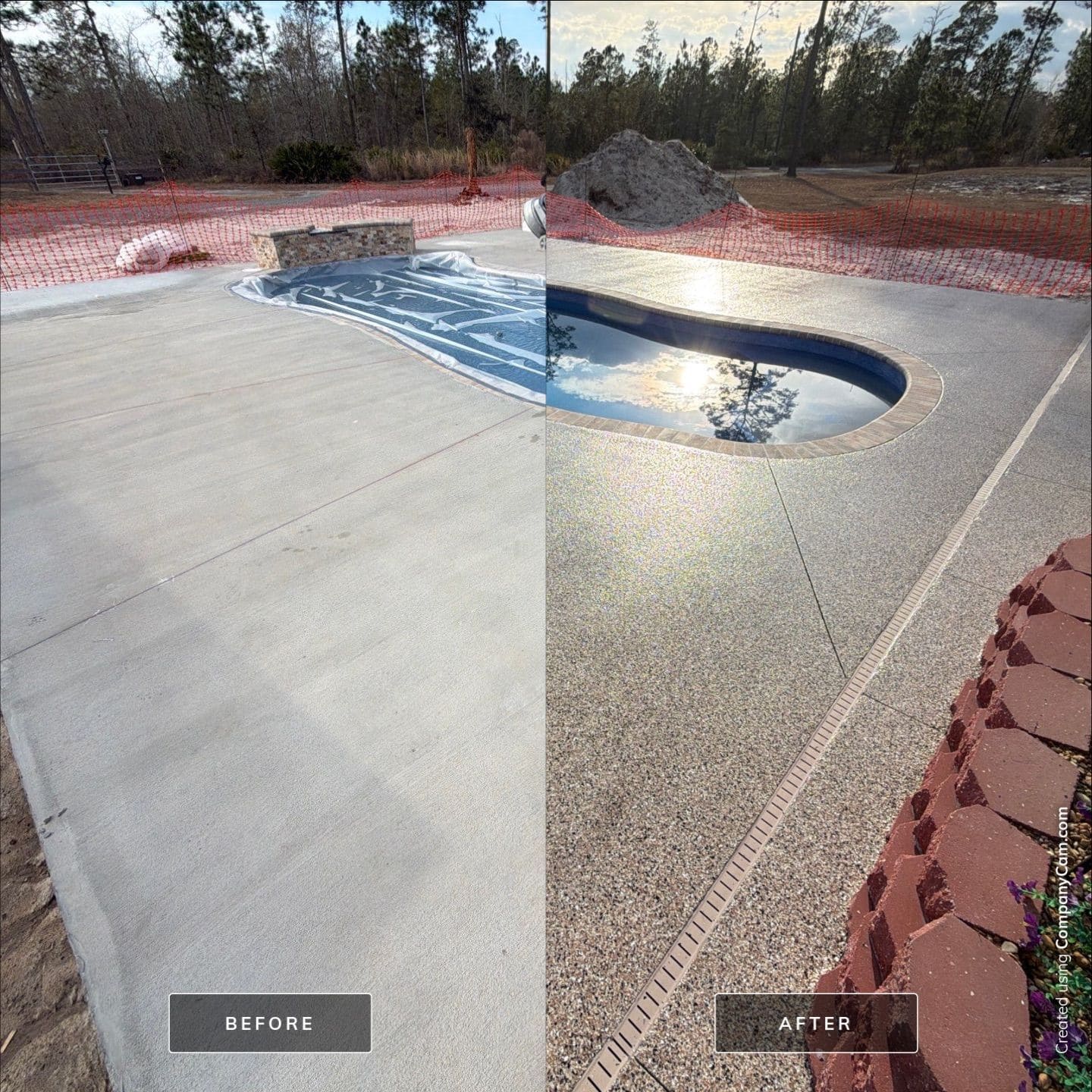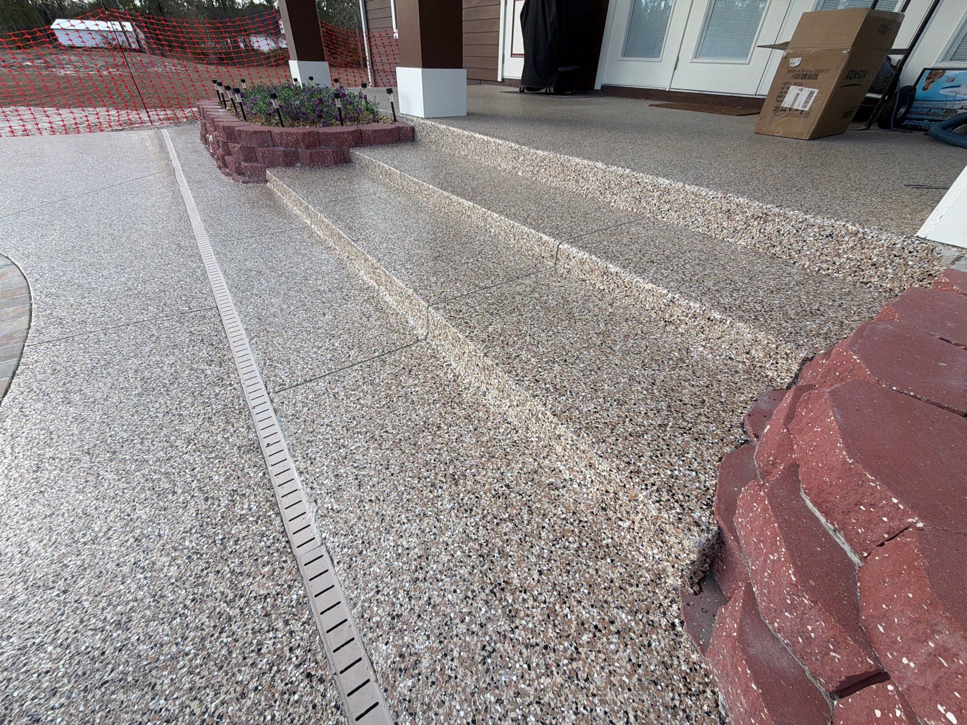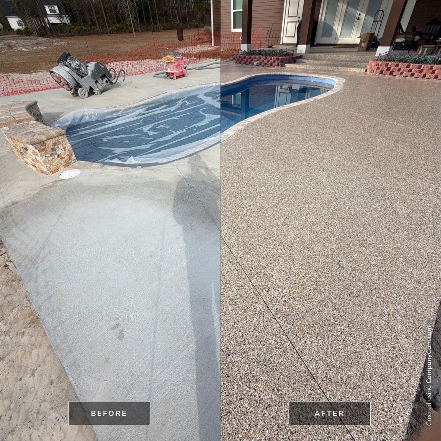 This pool deck was finished in our Outback flake blend, delivering a clean, modern look built for both comfort and safety. With detailed surface preparation, a polyurea base coat, full flake broadcast, and a protective polyaspartic topcoat, this system is slip-resistant, durable, and easy to maintain — perfect for poolside enjoyment all year long.
