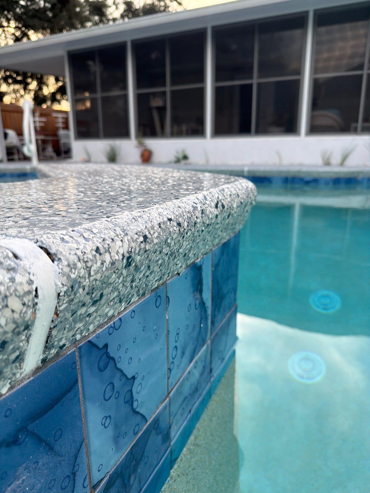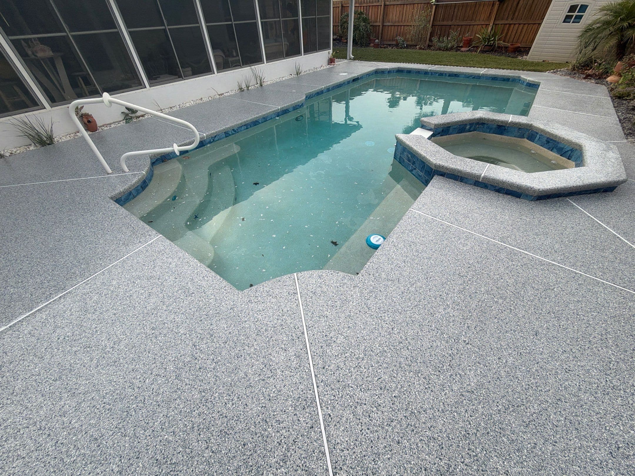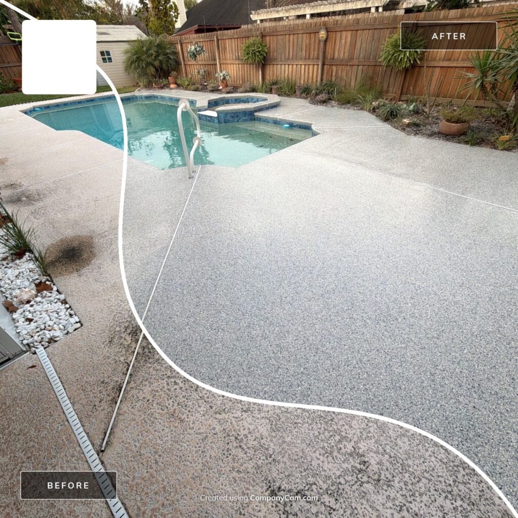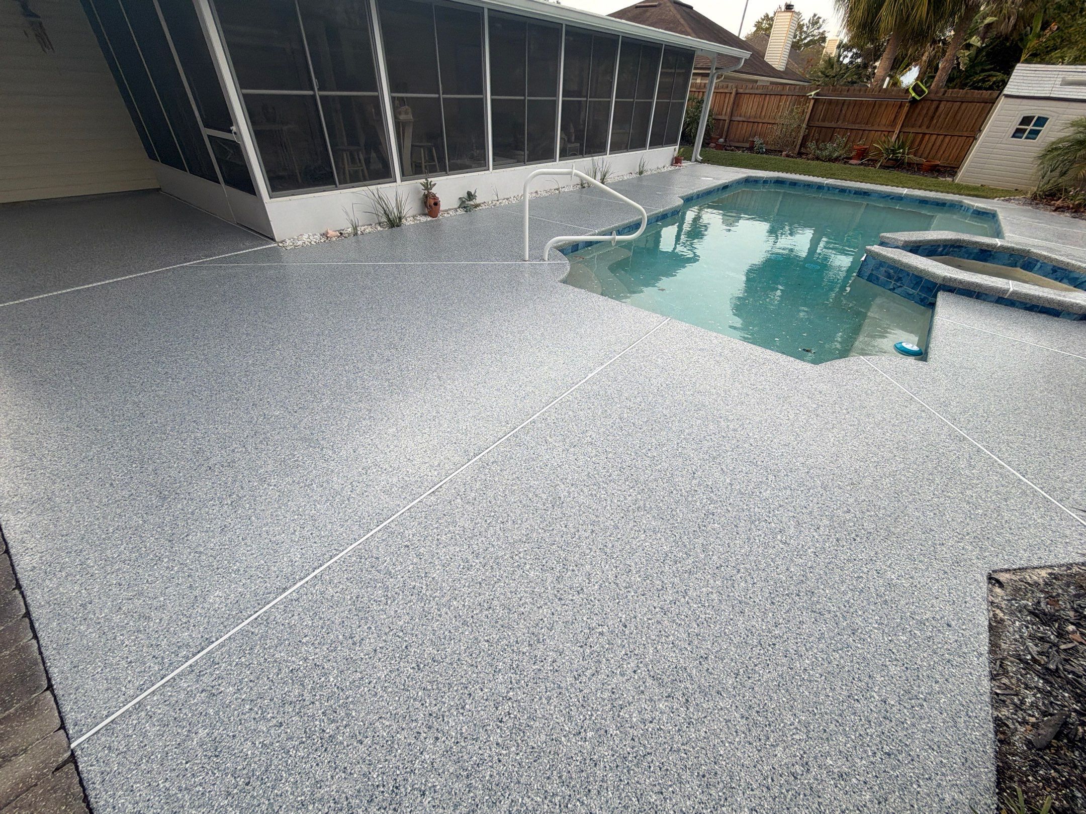 A fresh, resort-style upgrade for outdoor living. This pool deck was finished in the Tidal Wave flake blend, creating a clean, coastal look designed for comfort and safety. With detailed surface preparation, a polyurea base coat, full flake broadcast, and a protective polyaspartic topcoat, the surface is slip-resistant, durable, and easy to maintain—perfect for poolside enjoyment all year long.