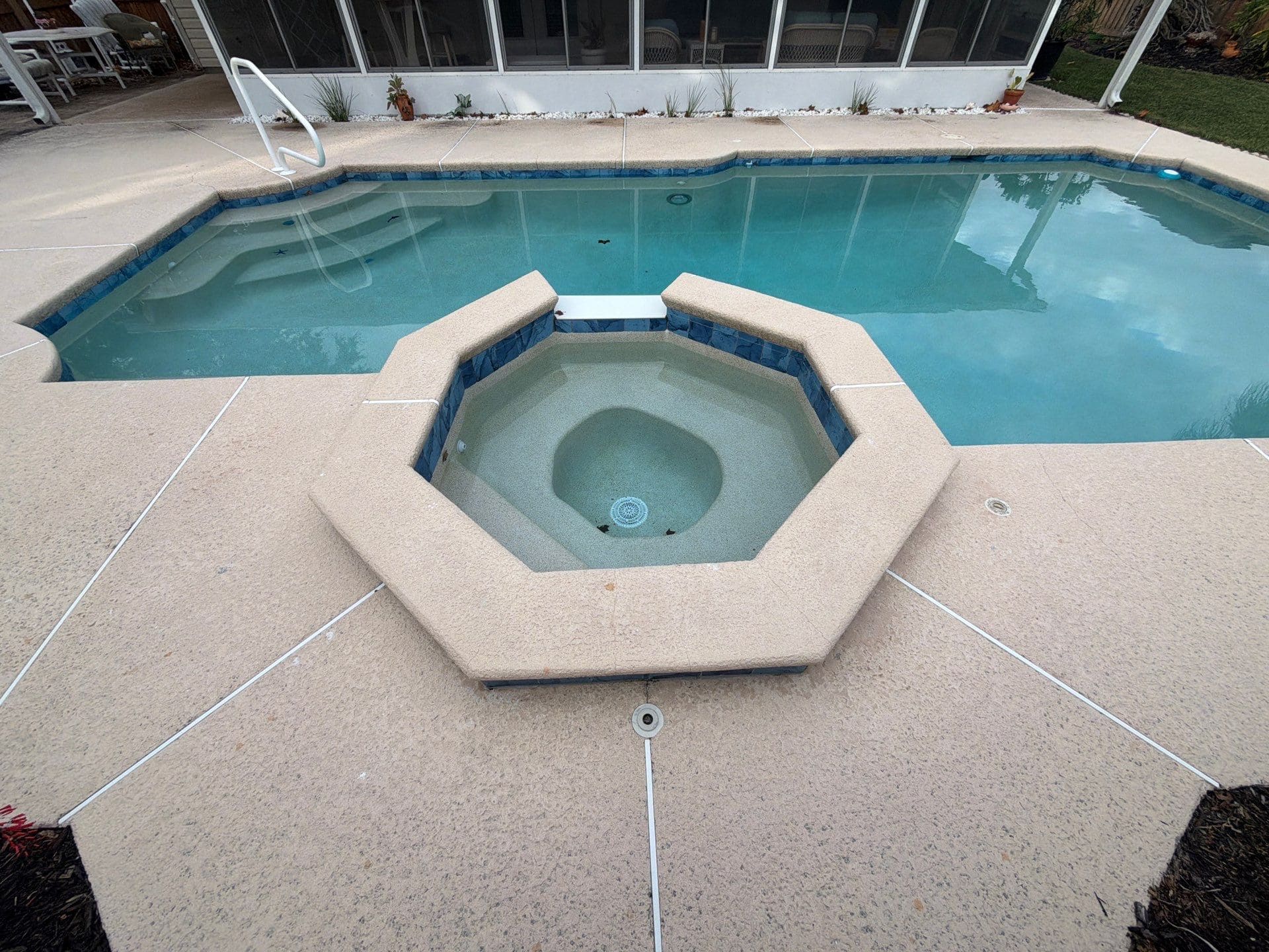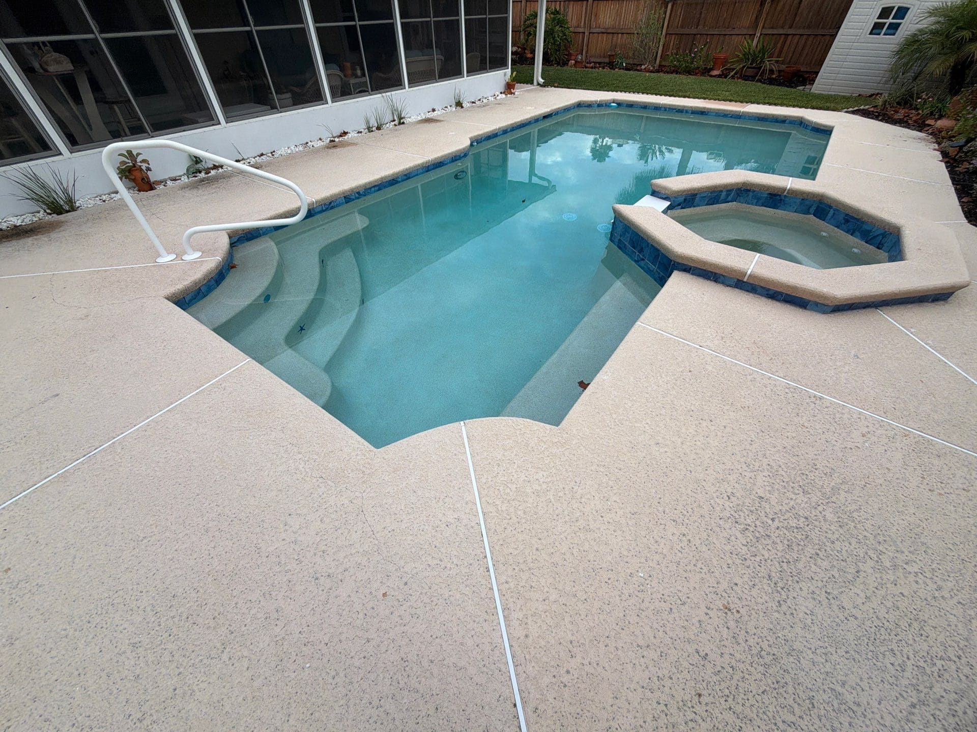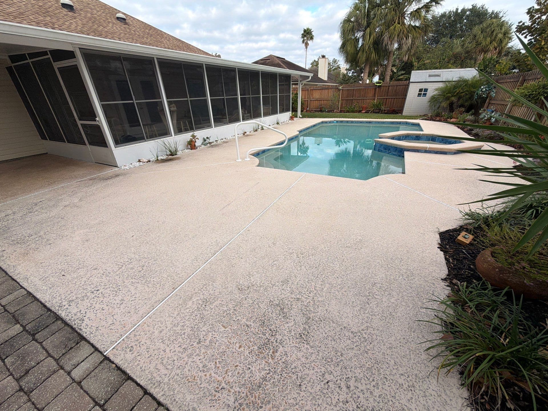 A fresh, resort-style upgrade for outdoor living. This pool deck was finished in the Tidal Wave flake blend, creating a clean, coastal look designed for comfort and safety. With detailed surface preparation, a polyurea base coat, full flake broadcast, and a protective polyaspartic topcoat, the surface is slip-resistant, durable, and easy to maintain—perfect for poolside enjoyment all year long.