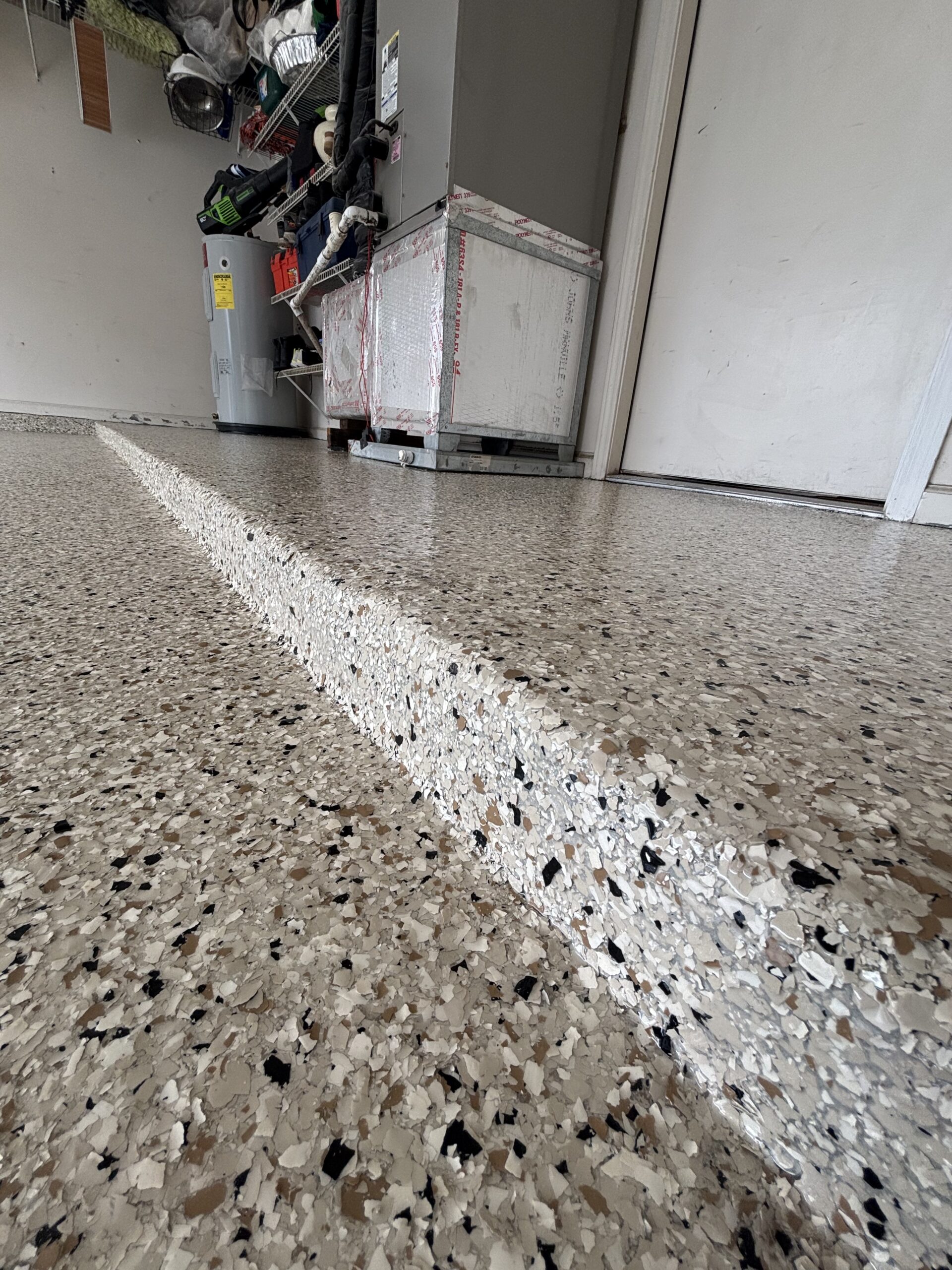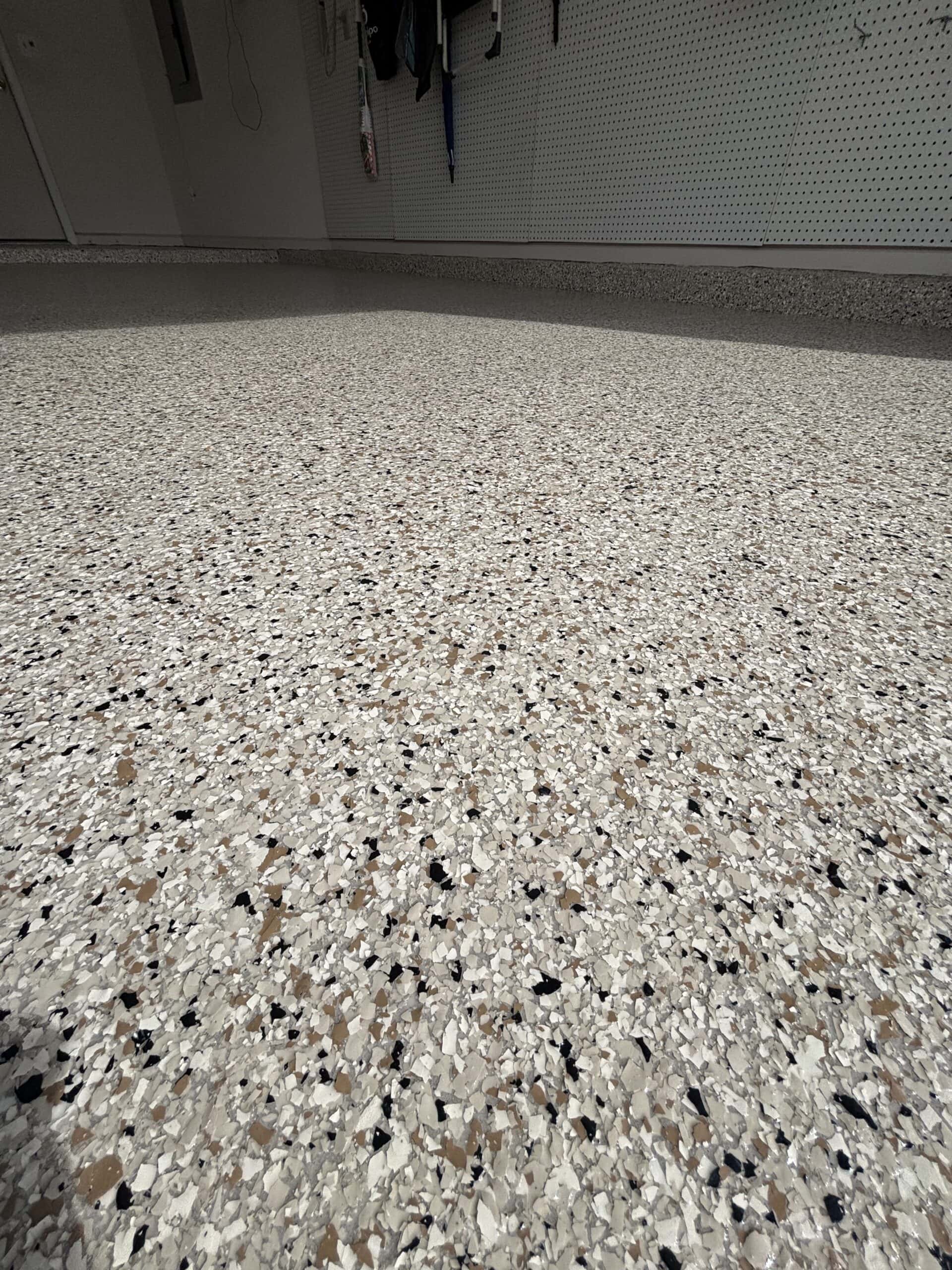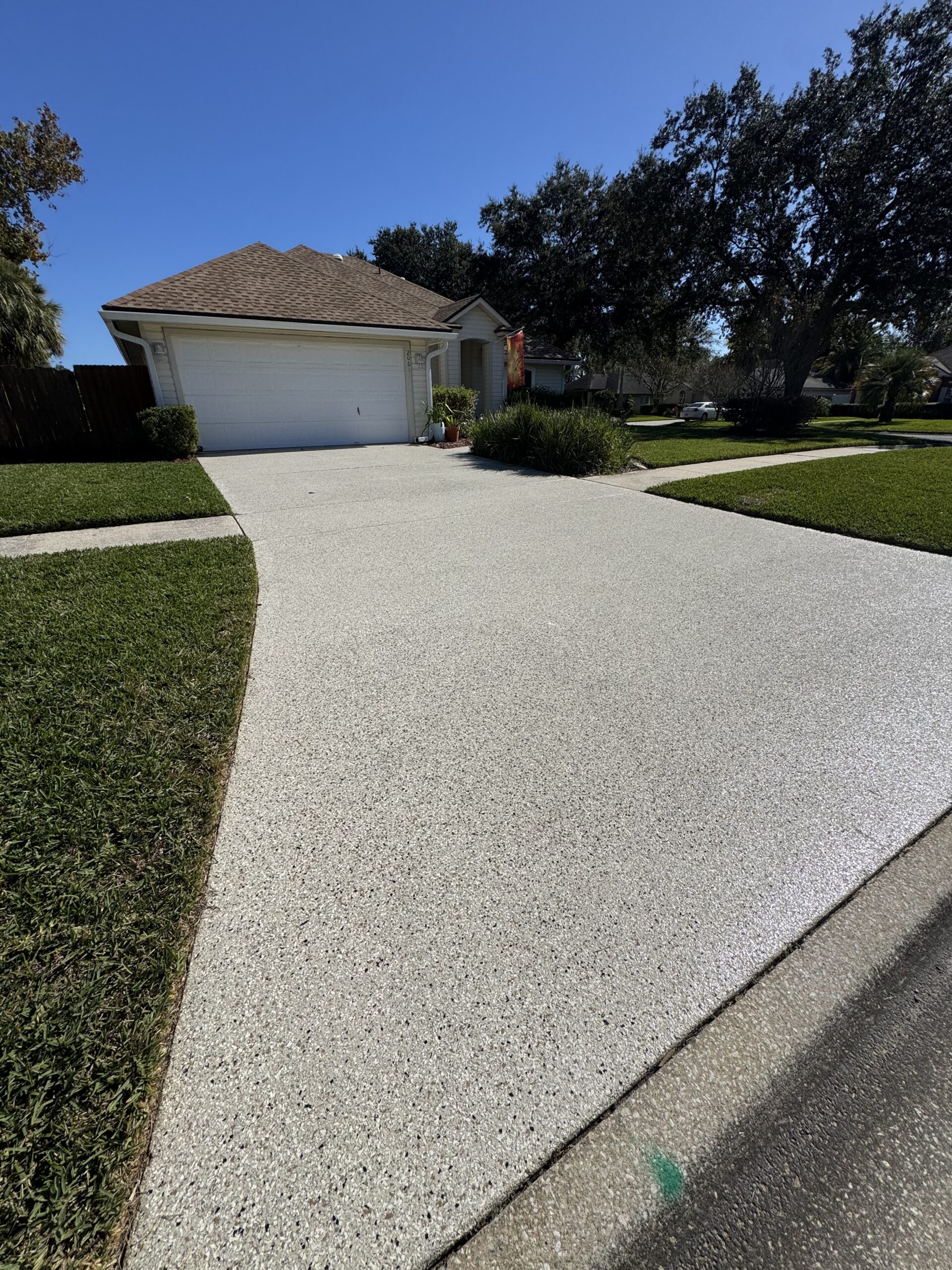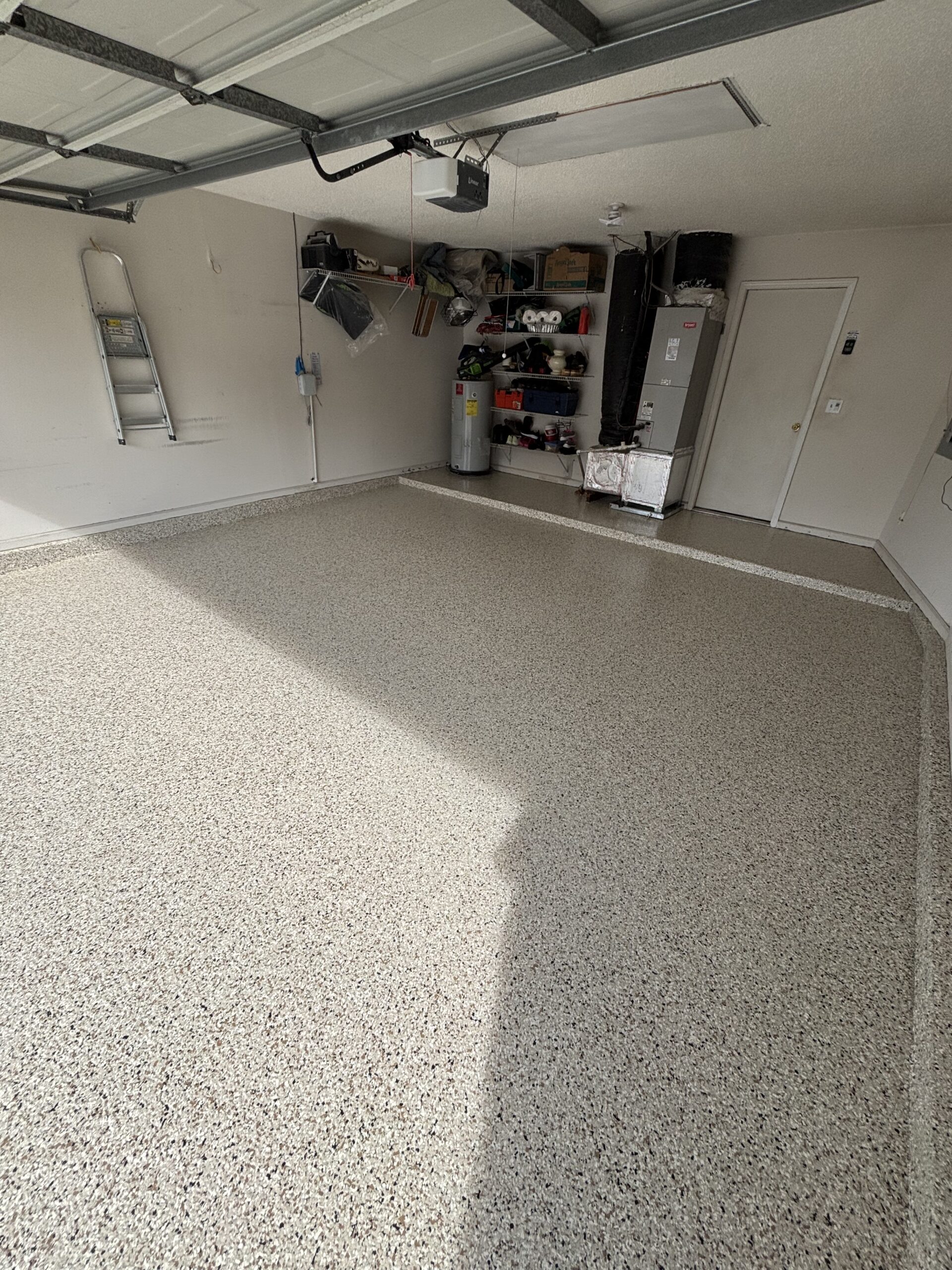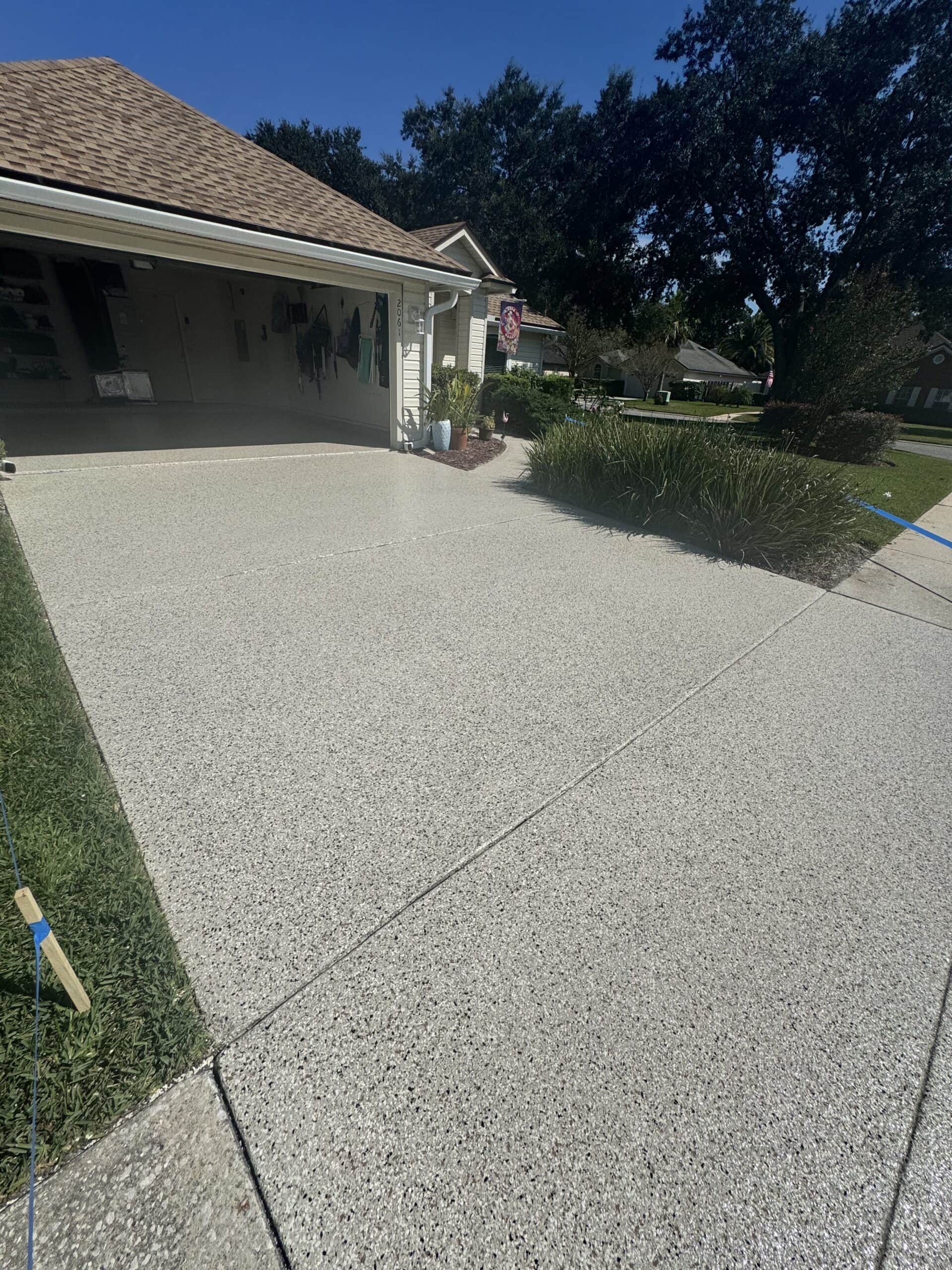 The driveway and garage were completed in the Shoreline flake blend, offering a sleek, modern contrast while enhancing curb appeal. Built to handle daily vehicle traffic, the system features the same high-performance polyurea base and polyaspartic topcoat for superior durability, UV stability, and long-term protection against wear, staining, and Florida’s harsh climate.