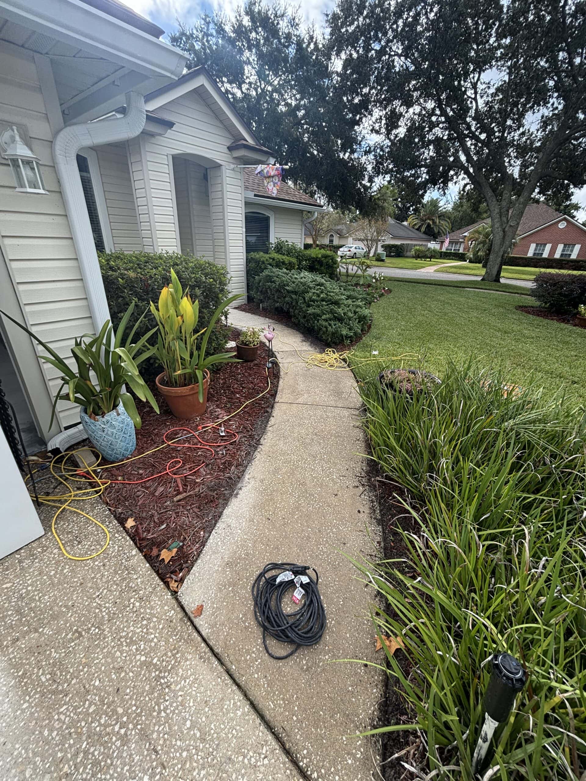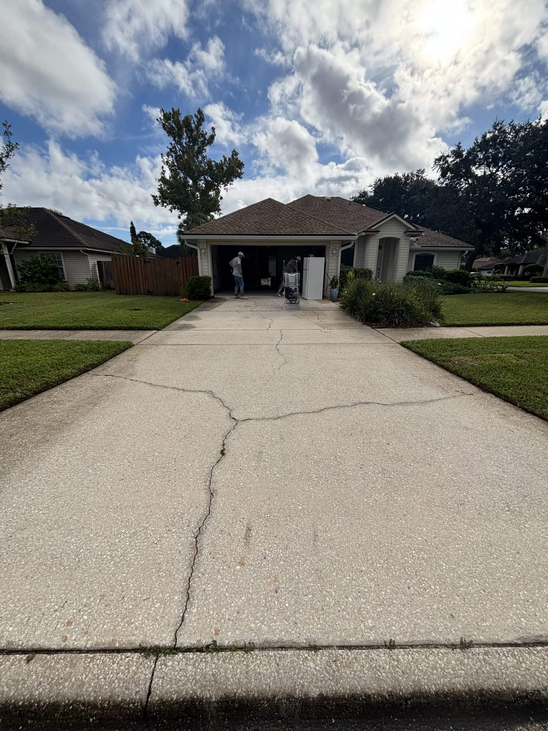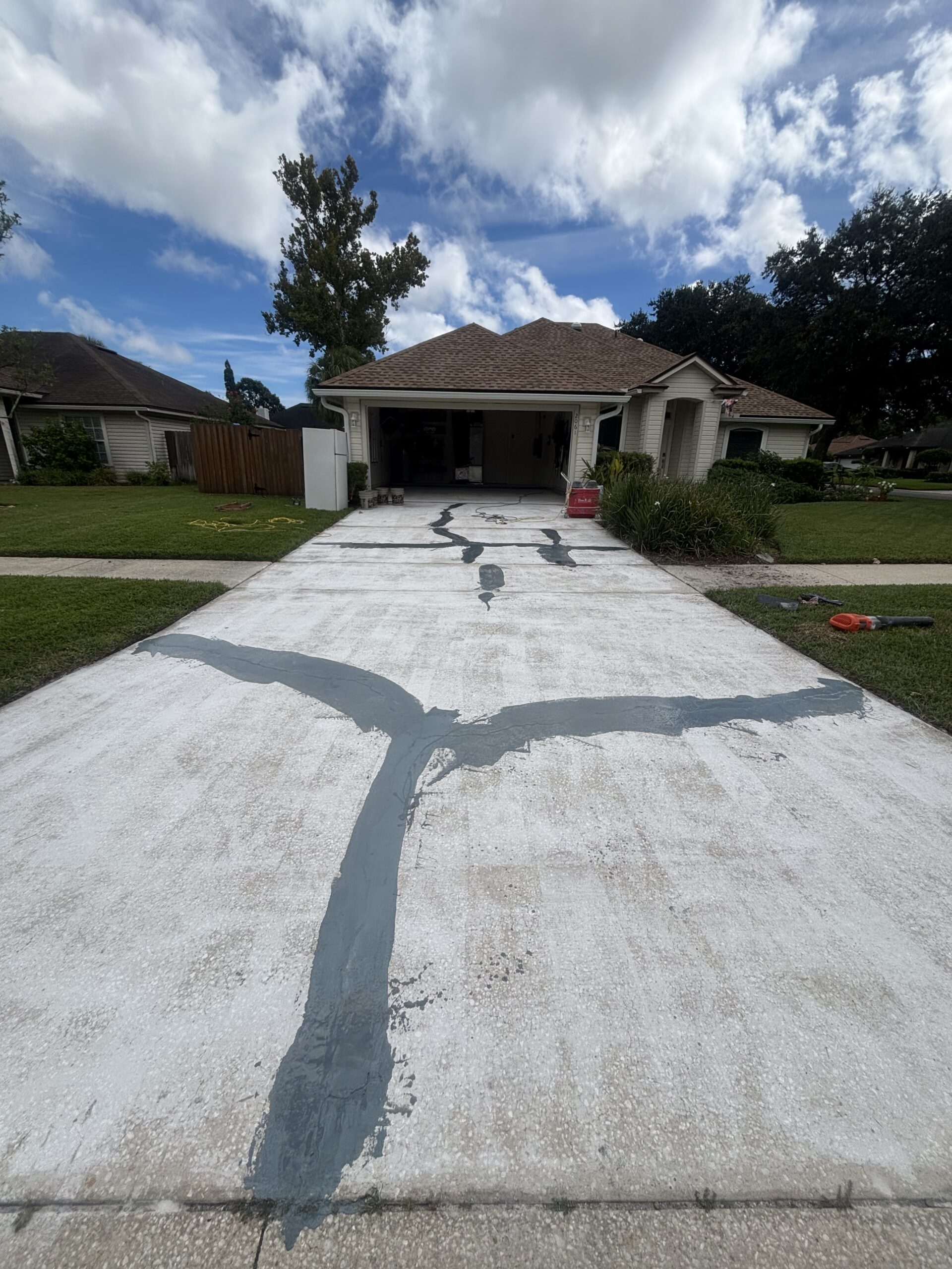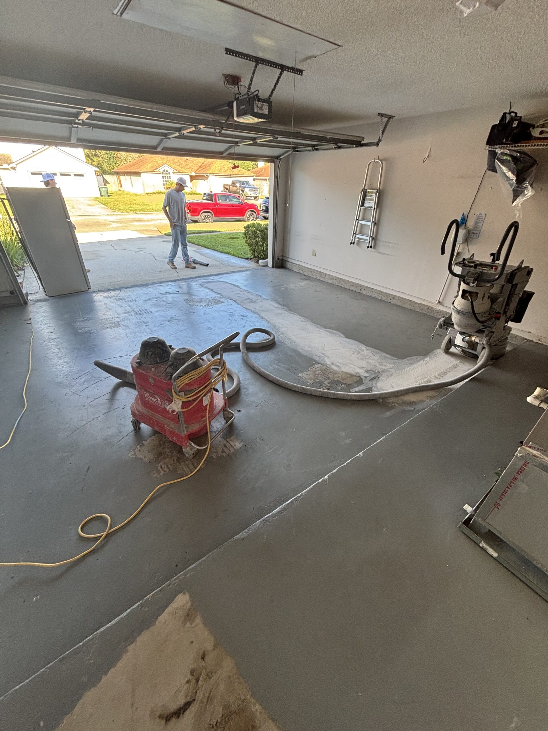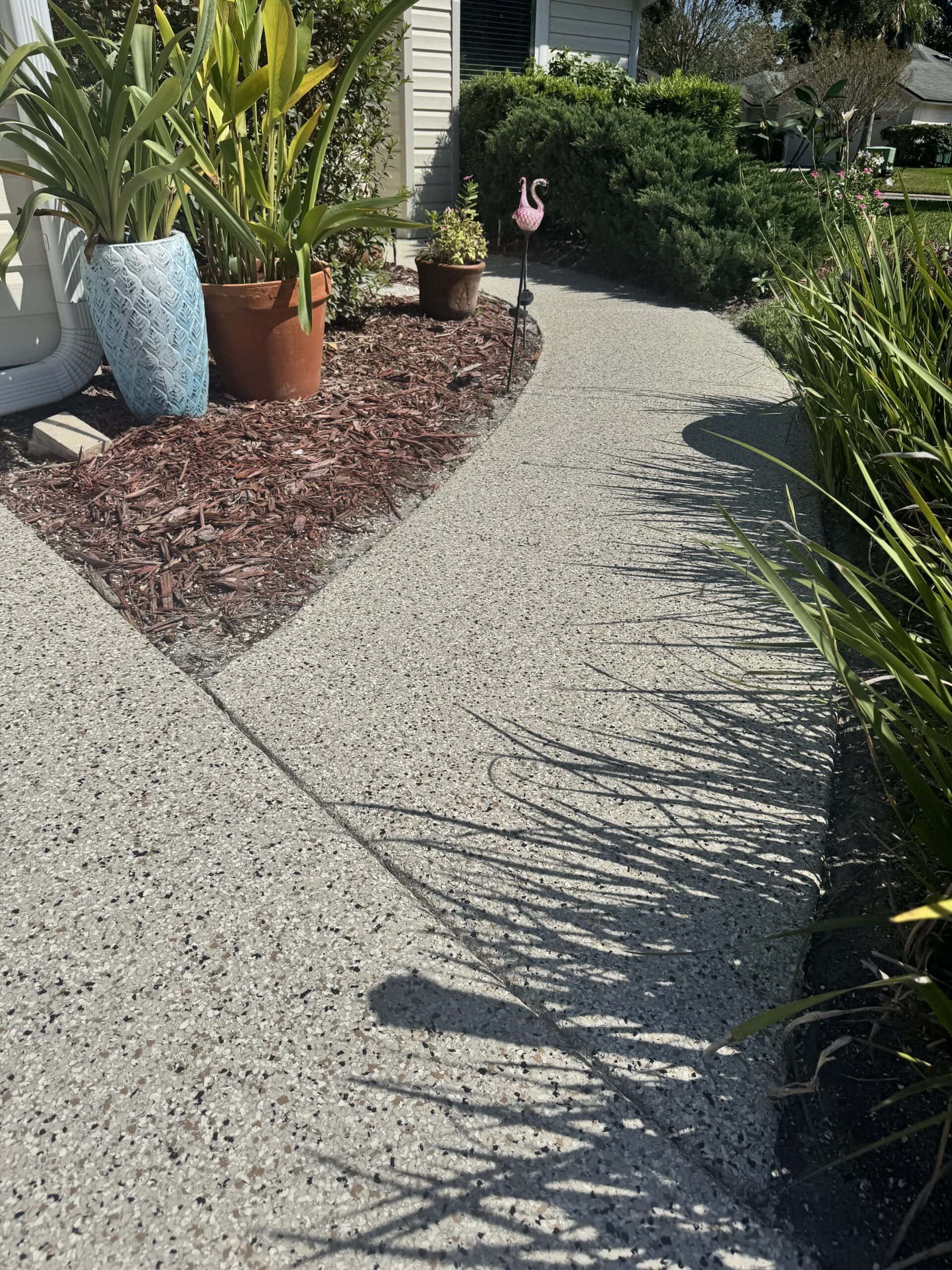 The driveway and garage were completed in the Shoreline flake blend, offering a sleek, modern contrast while enhancing curb appeal. Built to handle daily vehicle traffic, the system features the same high-performance polyurea base and polyaspartic topcoat for superior durability, UV stability, and long-term protection against wear, staining, and Florida’s harsh climate.