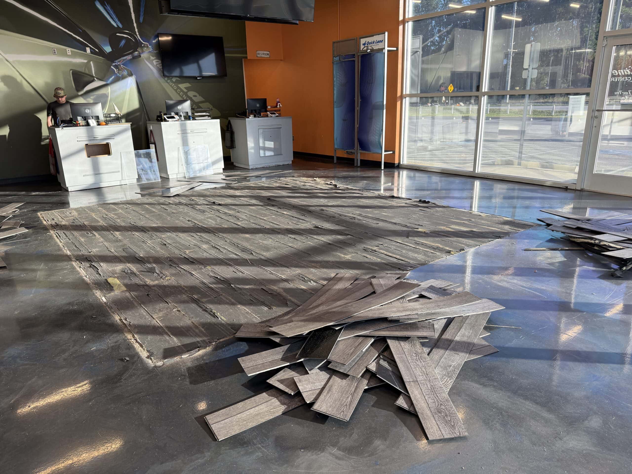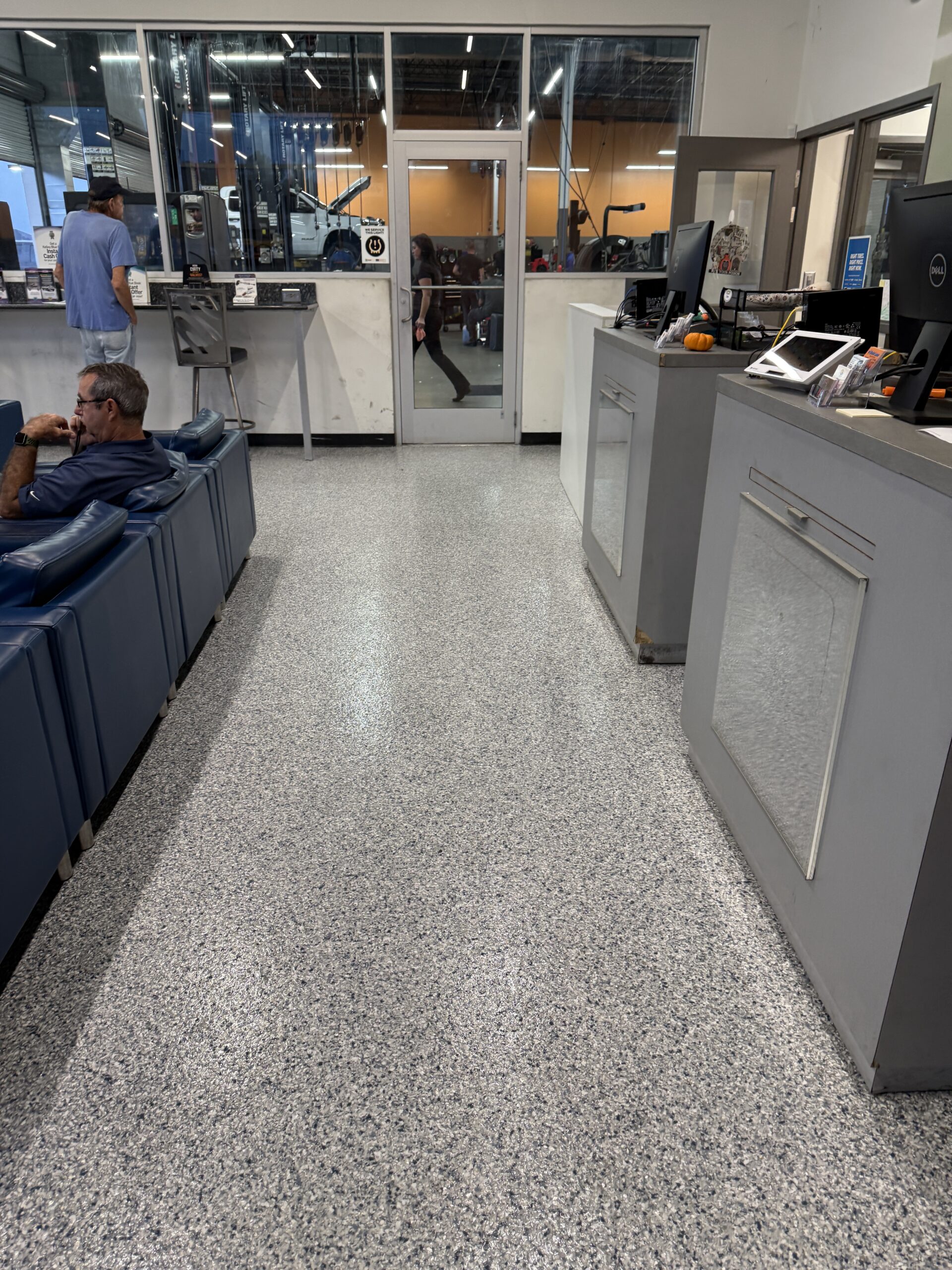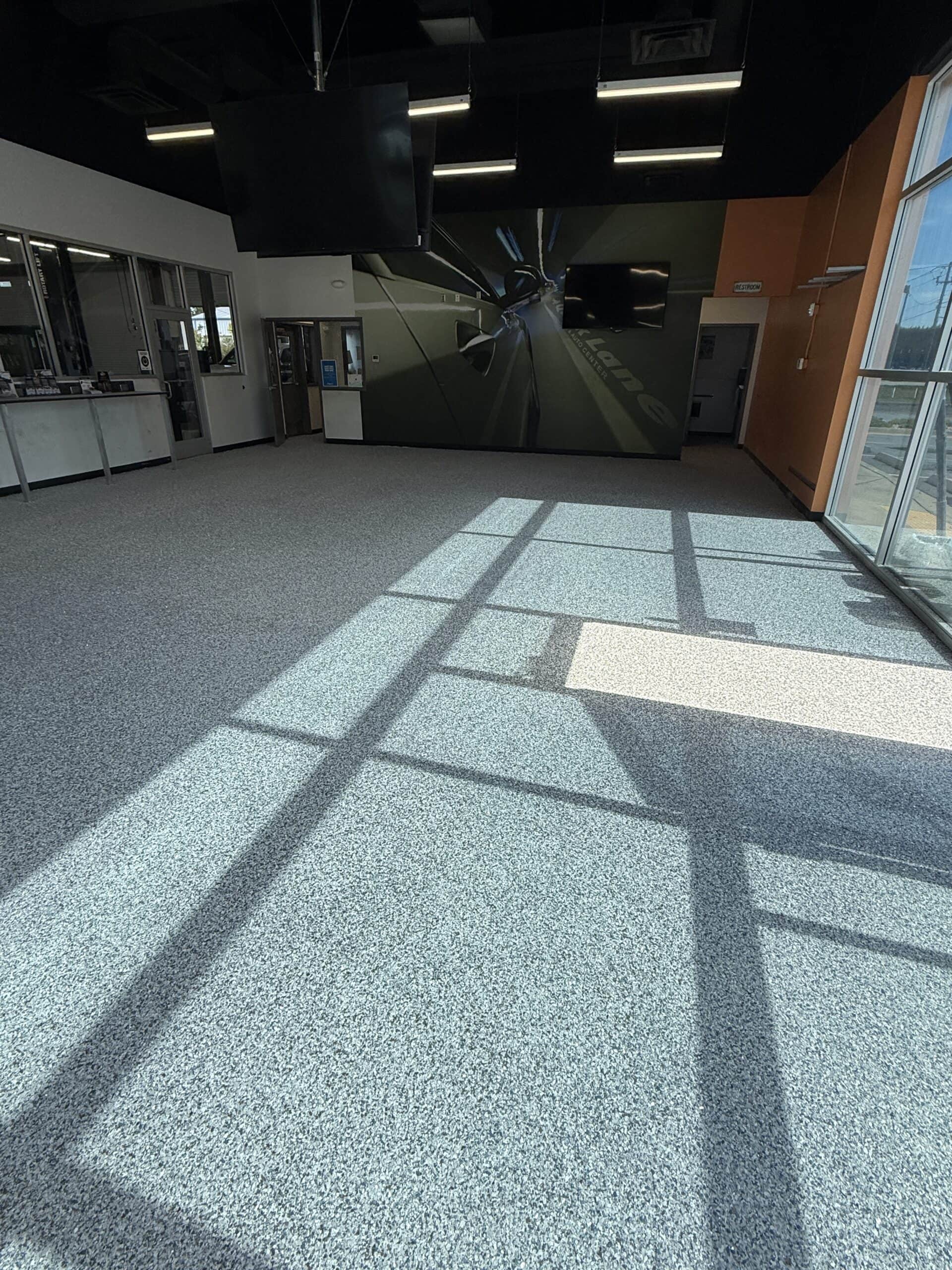 A complete interior transformation at the Quick Lane Tire Center at Murray Ford of Kingsland. The waiting room, office, and bathrooms were resurfaced in a custom Tidal Wave blend with Micah flake. The process included detailed surface preparation, a polyurea base coat, full flake broadcast, and a protective polyaspartic topcoat—resulting in a durable, slip-resistant, and easy-to-maintain finish. Don’t miss the before-and-after photos—the difference speaks for itself..