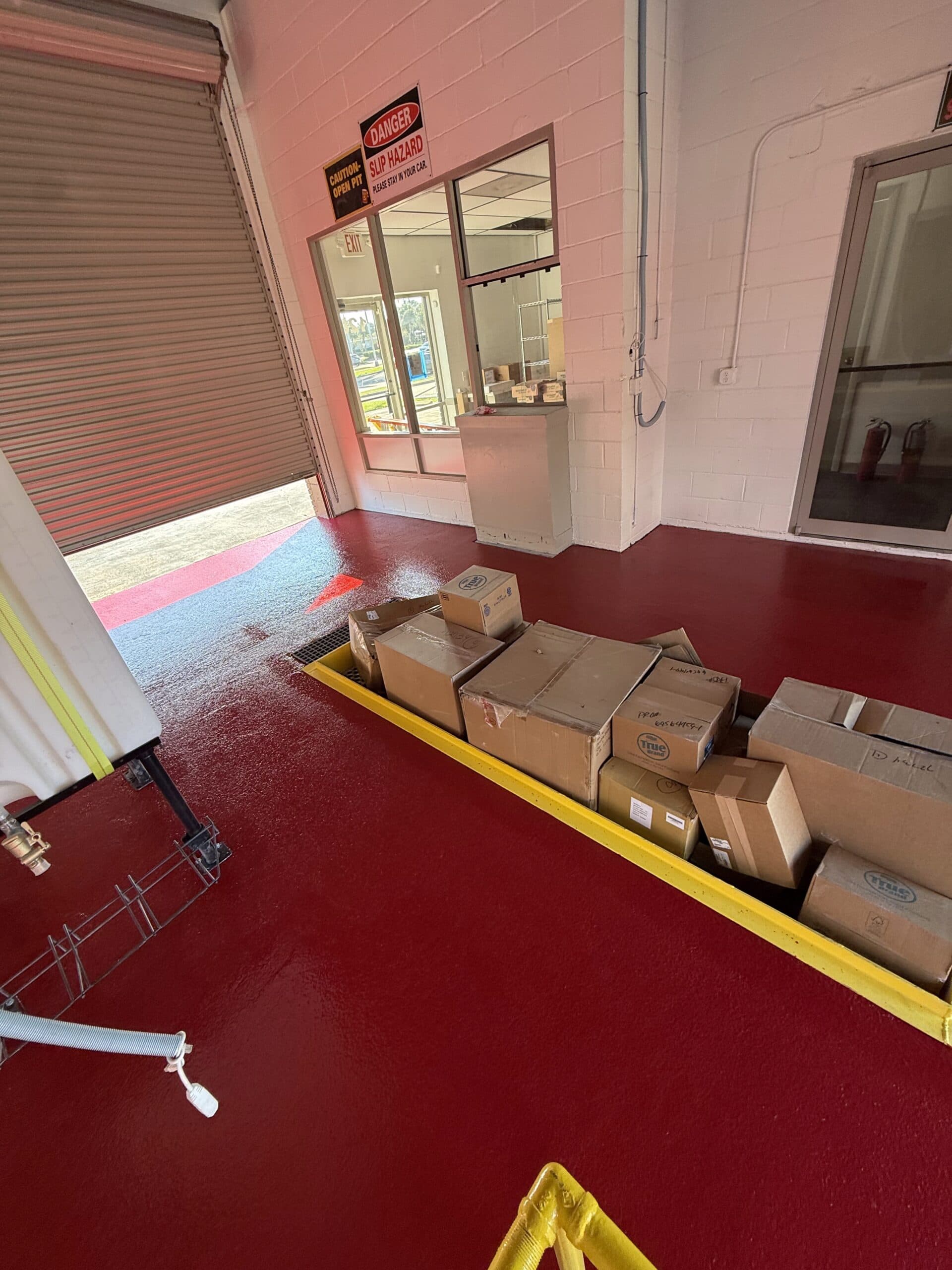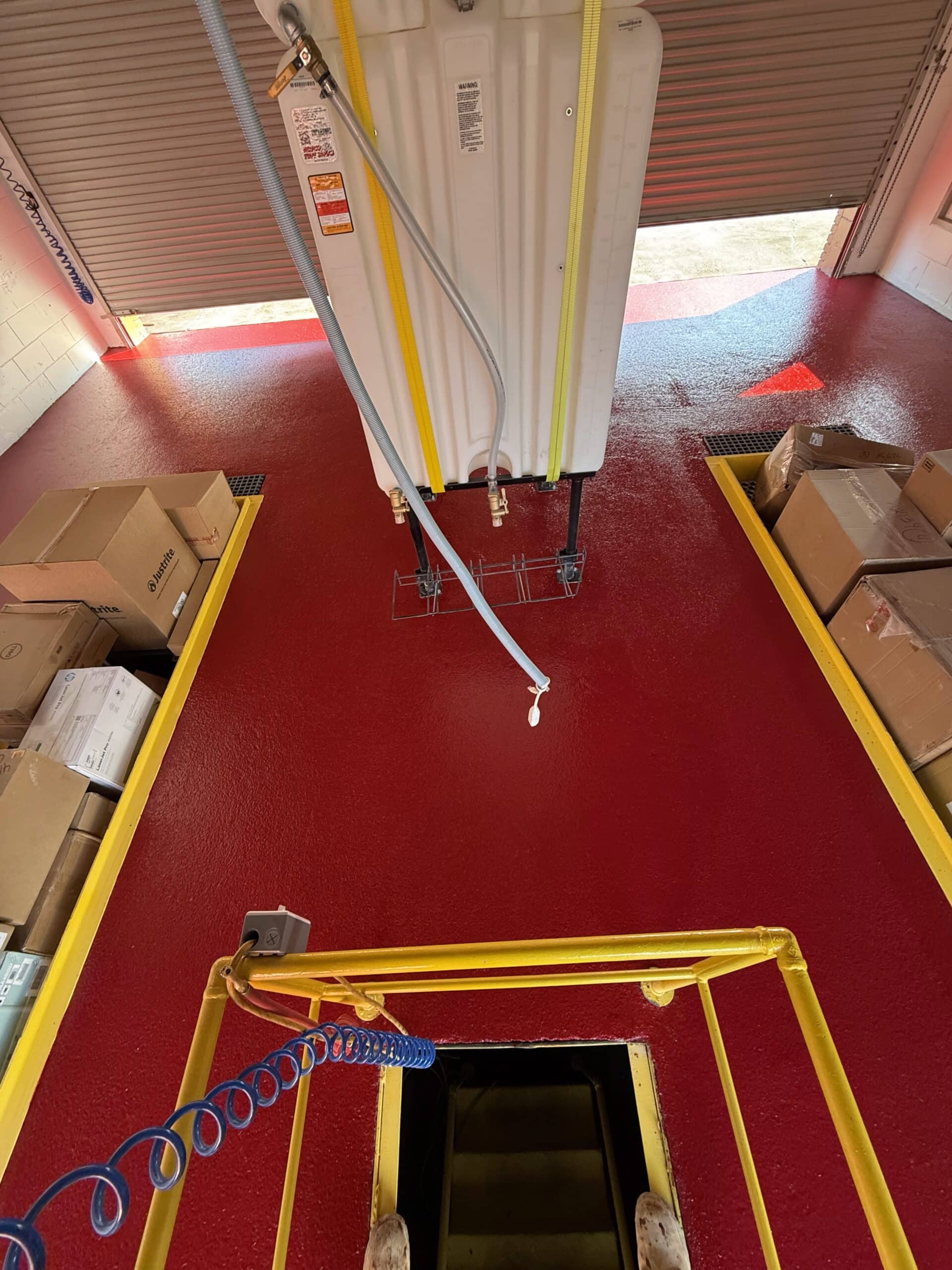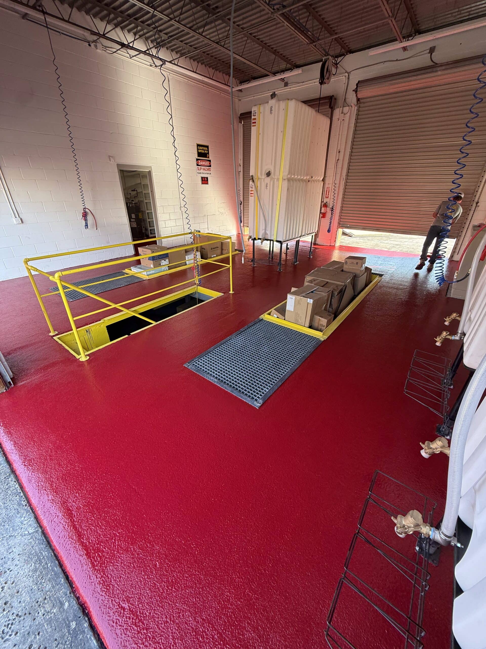 A full interior upgrade at Take 5 Oil Change, finished with a custom blend of Torginol’s Tomato color for a bold, high-visibility look. The process included detailed surface preparation, a skim coat of urethane cement to ensure proper adhesion to the oily substrate, a polyurea base coat, full flake broadcast, and a protective polyaspartic topcoat—resulting in a durable, slip-resistant, and easy-to-clean surface built for a fast-paced service environment.